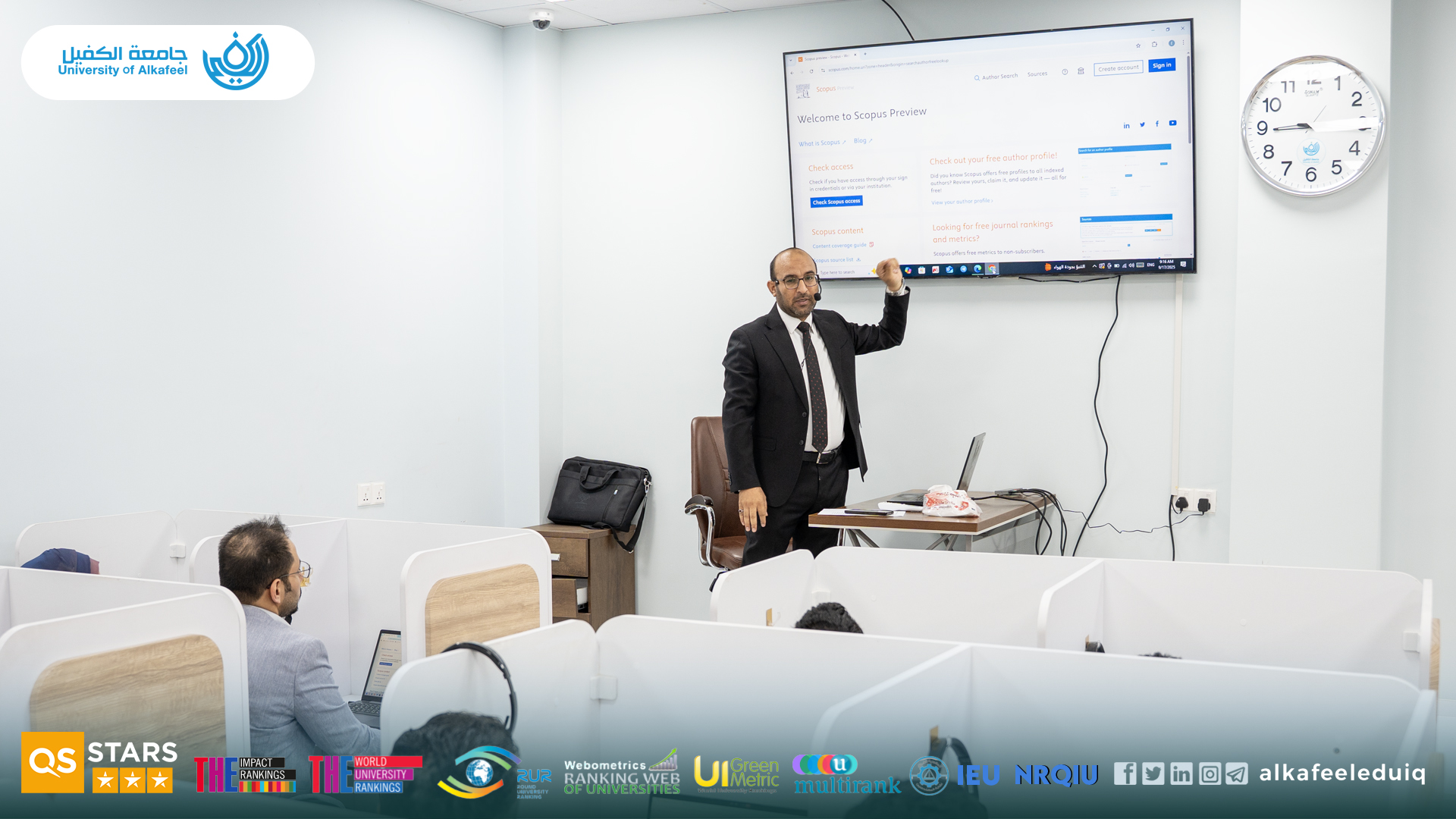 Under the supervision of the Alkafeel University Presidency and in the presence of the vice-chancellor for academic affairs, Prof.Dr. Nawal Ayed Al-Mayali, a specialized workshop : "How Researchers Can Leverage Scopus and Clarivate" was held on Wednesday, 17 September 2025. The workshop aimed to enhance the skills of faculty members and researchers in accessing reliable and diverse academic sources.