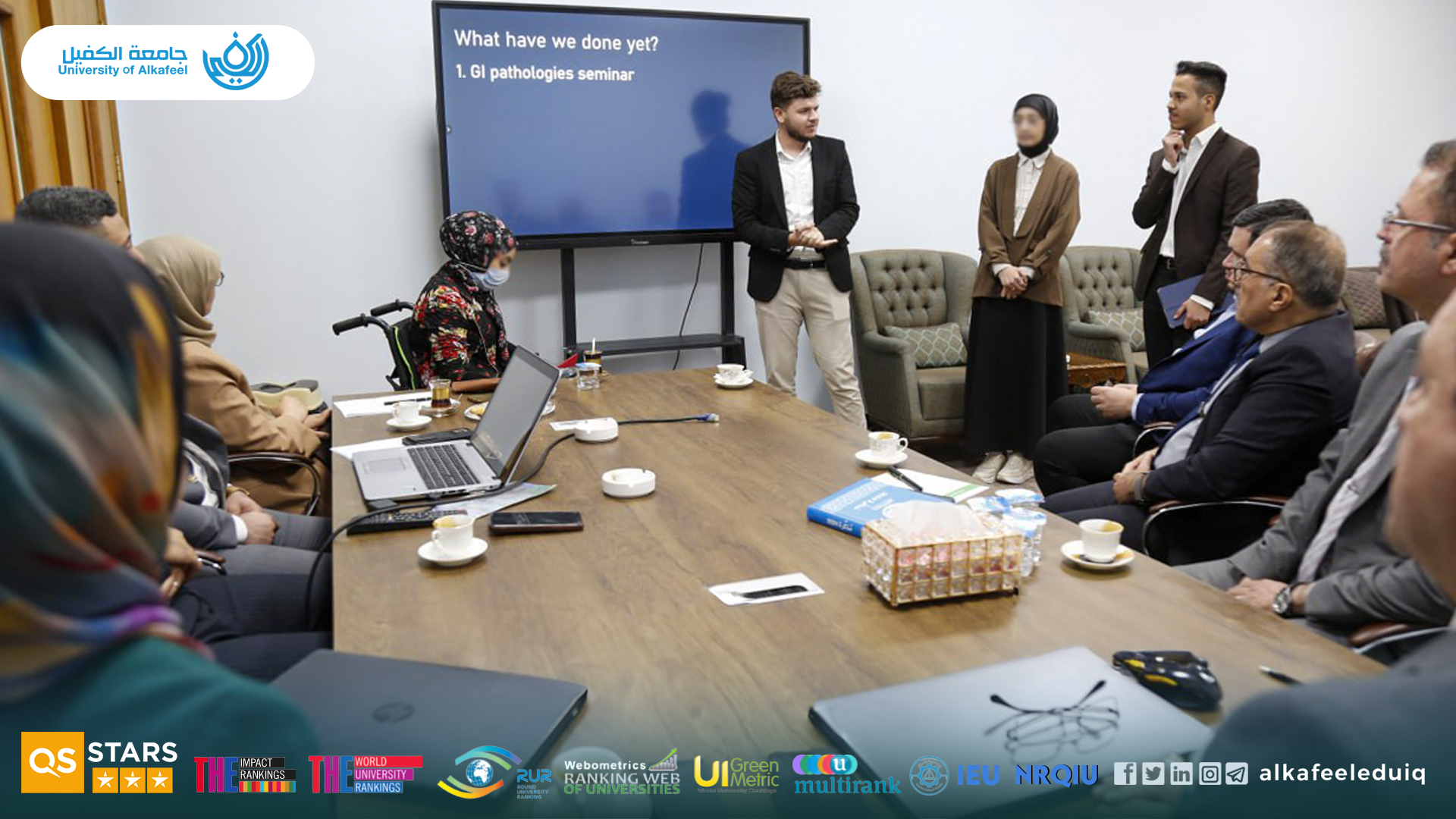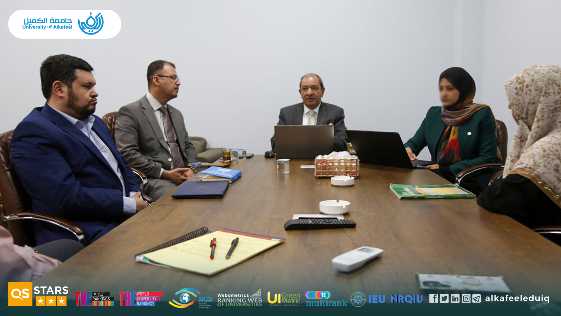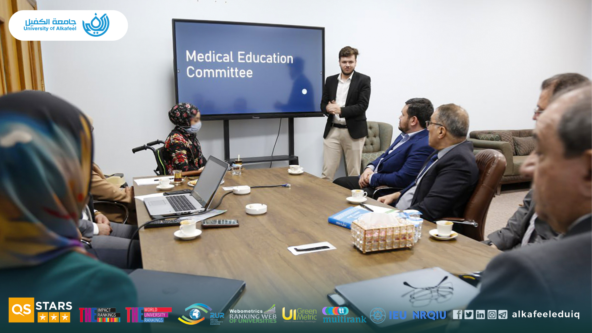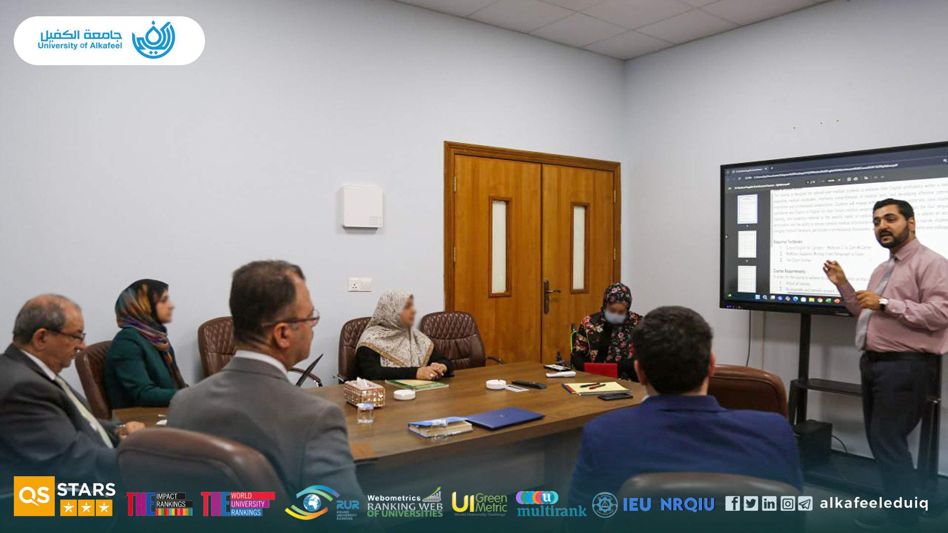 On Monday, 29 September 2025, the College of Medicine at University of Alkafeel held a meeting for the Curriculum Committee with a number of English language experts. The meeting was chaired by the Dean of the College, Asst. Prof. Dr. Samer Maki Al-Hakak, and his assistants, and attended by the Head of Medical Education, Prof. Dr. Hilal Bahjat Al-Saffar. This meeting was held to discuss ways to develop a supplementary English language curriculum specifically designed for medical students in the light of the nature of medical vocabulary and terminology and the basic language skills students need during their academic studies and clinical training.