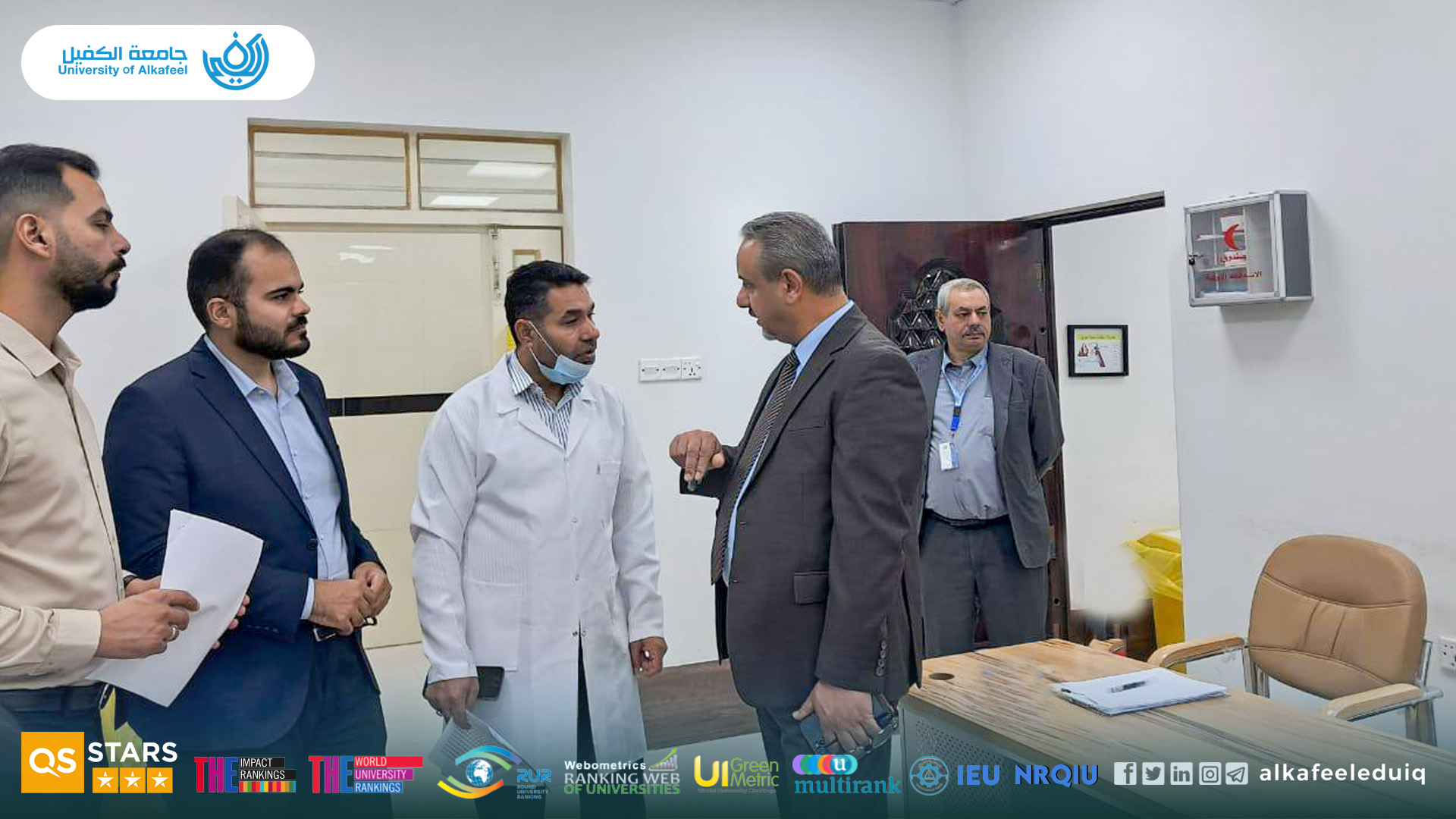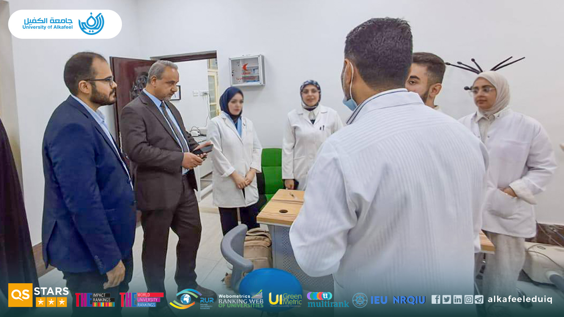 The Dean was accompanied during the visit by the Clinics Director, Asst. Prof. Mustafa Fares Mashkoor, and a number of staff. He observed the clinics and listened to a detailed explanation of the workflow and the level of educational services provided to students during their daily clinical training.
