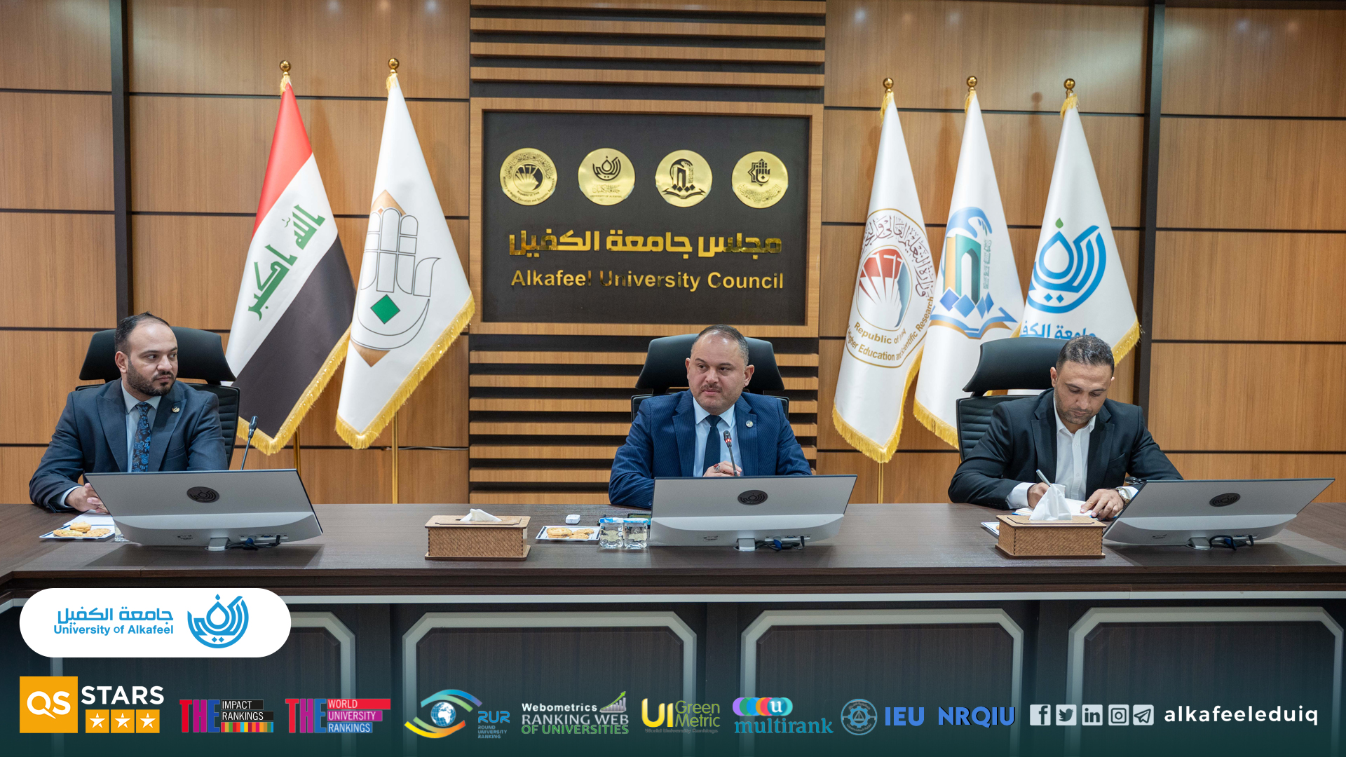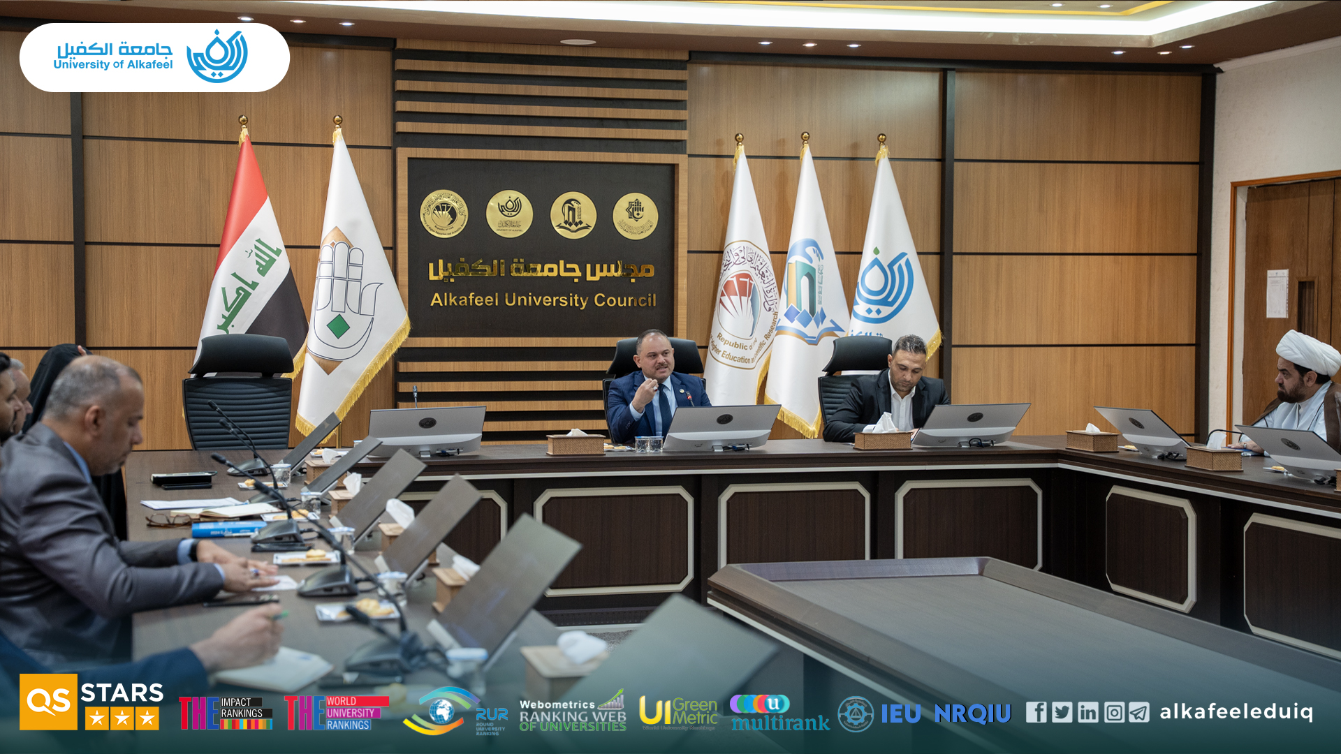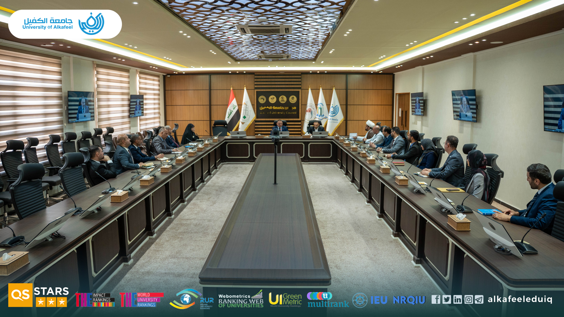 The University of Alkafeel Council held its meeting for the 2025-2026 academic year on Saturday, October 12, 2025, and was chaired by the university president, Prof. Dr. Nawras Mohammed Shaheed Al-Dahan, and attended by vice-chancellor for scientific Affairs , Prof. Dr. Nawal Ayed Al-Mayali, the deans of the colleges . The meeting reviewed preparations for the seventh international conference, which the university prepares to organize and set deadlines for participation and accompanying events.