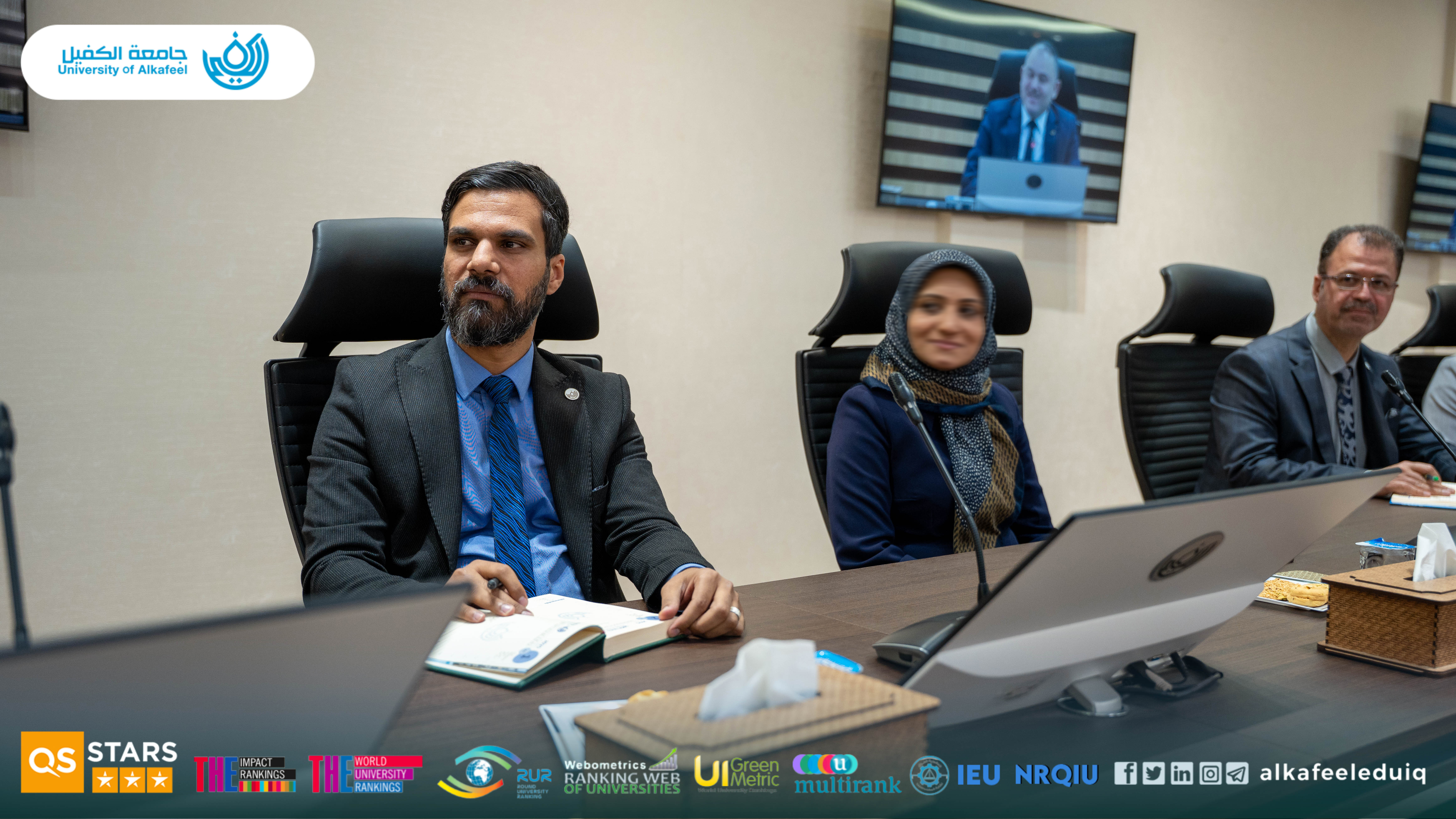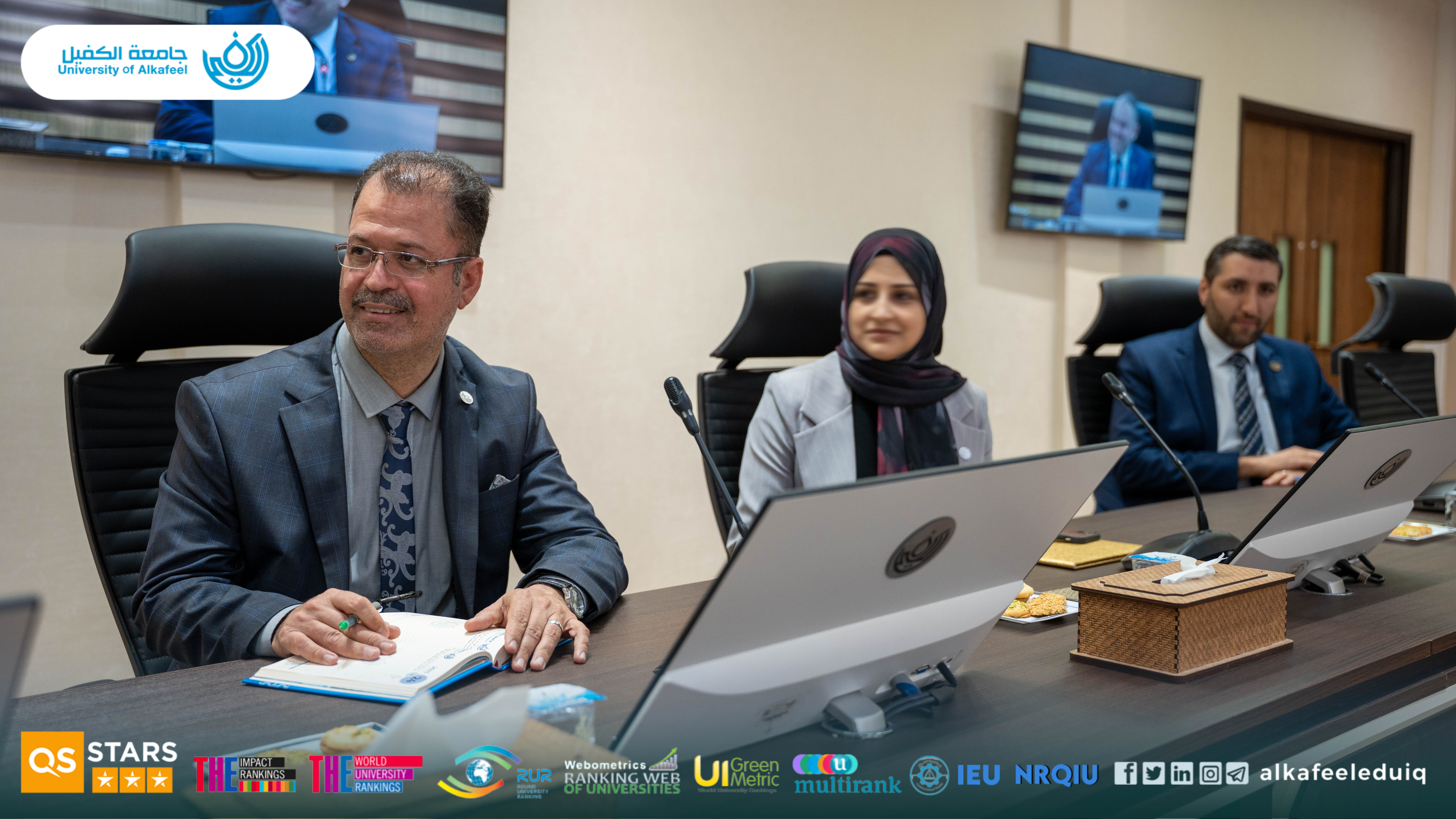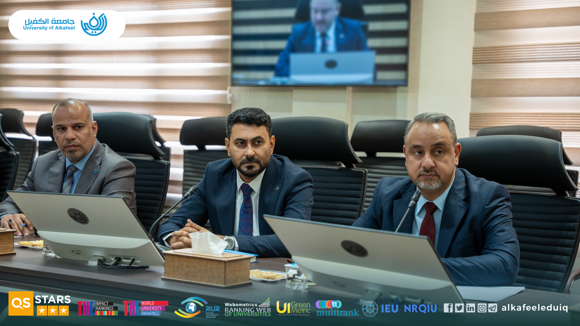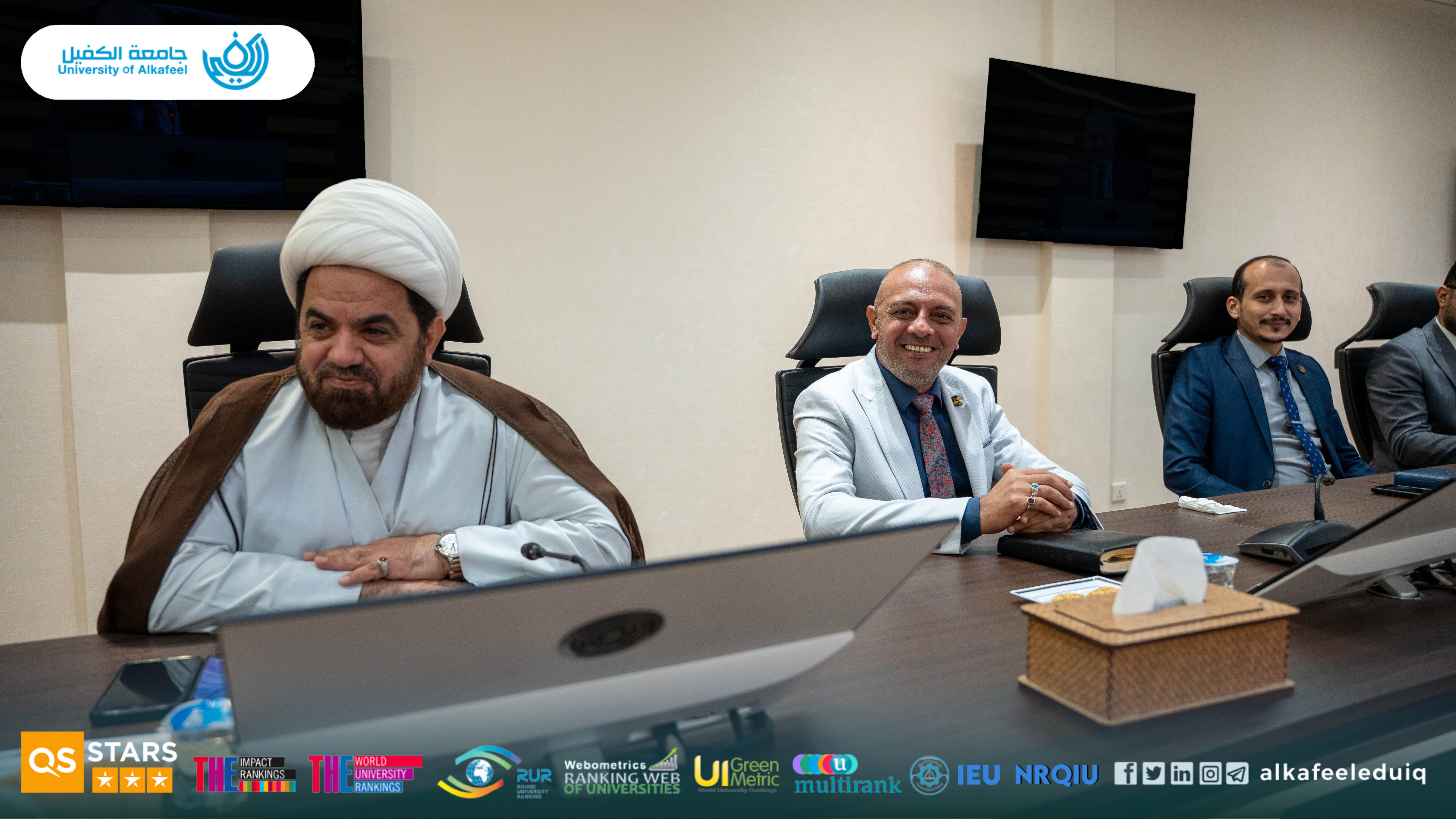 The University of Alkafeel Council held its meeting for the 2025-2026 academic year on Saturday, October 12, 2025, and was chaired by the university president, Prof. Dr. Nawras Mohammed Shaheed Al-Dahan, and attended by vice-chancellor for scientific Affairs , Prof. Dr. Nawal Ayed Al-Mayali, the deans of the colleges . The meeting reviewed preparations for the seventh international conference, which the university prepares to organize and set deadlines for participation and accompanying events.
