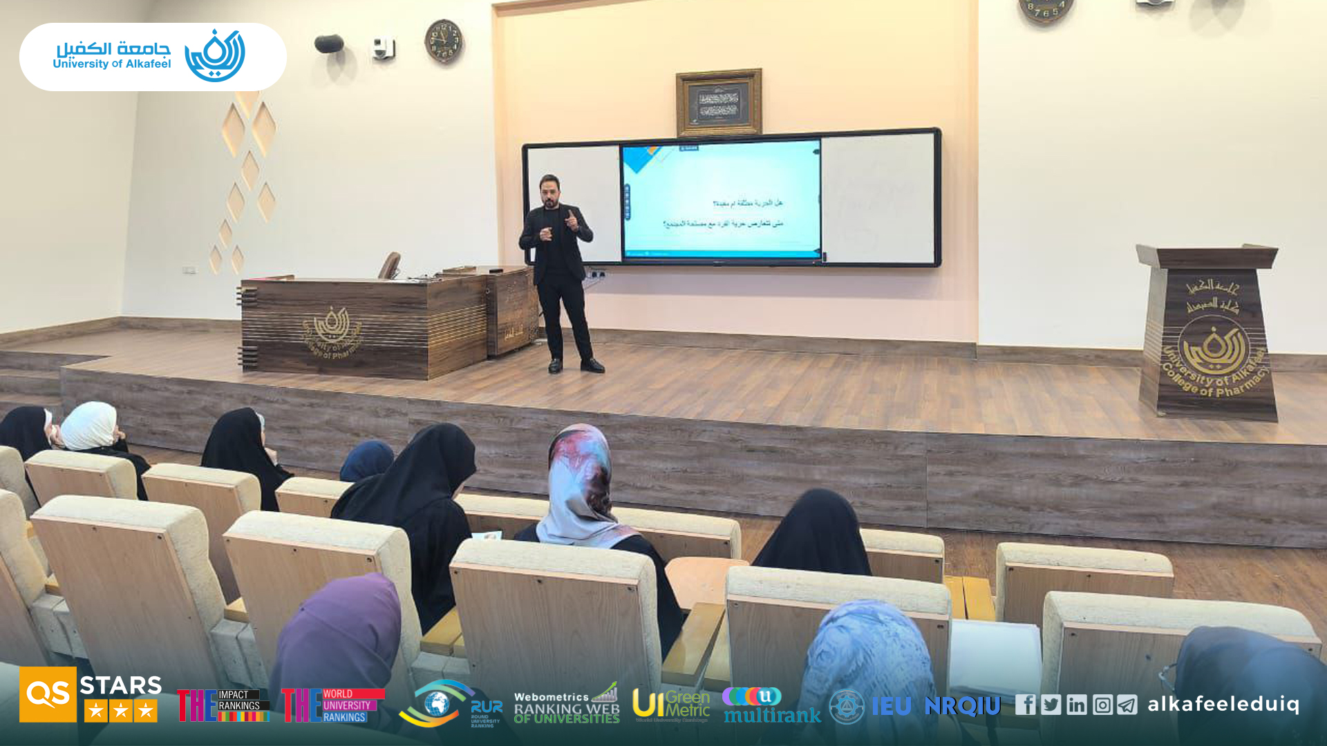 The Department of Psychological Guidance and Educational Orientation , in collaboration with the College of Pharmacy, organized an educational lecture : "Individual Freedom and Community Interest." The lecture was delivered by Asst. Prof. Haider Adnan Ghazi on Wednesday, 15 October 2025 for second-year students. The lecture addressed the concept of individual freedom, its limits, and the importance of balancing personal freedom with the public interest. It addressed intellectual questions about when freedom becomes a threat to society and when it is a right of the individual and explained that freedom is a moral responsibility governed by laws and collective awareness, emphasizing that the balance between individual freedom and the public interest is achieved through individual awareness, the justice of the law, and the strength of community institutions.