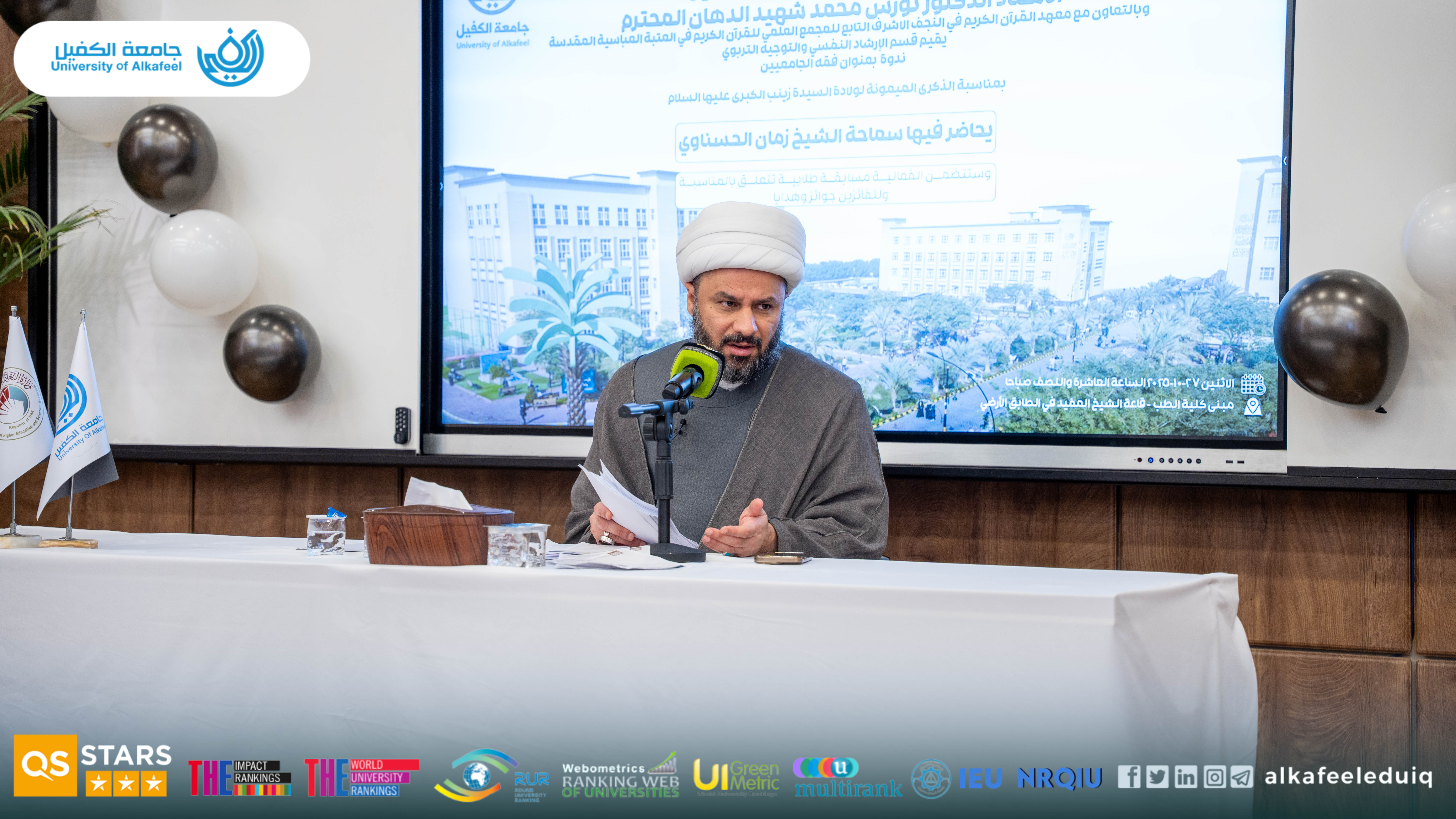 Under the patronage of the President of University of Alkafeel , Prof.Dr. Nawras Mohammed Shaheed Al-Dahan, and in cooperation with Glorious Quran Institute in Najaf Al-Ashraf, pertinent to Holy Abbas Shrine, the Department of Psychological Guidance and Educational Orientation at University of Alkafeel held an awareness and cultural seminar : " Fiqh for University Students " on the occasion of the blessed anniversary of the birth of Seida. Zainab Al-Kubra (peace be upon her) on Monday, October 27, 2025.