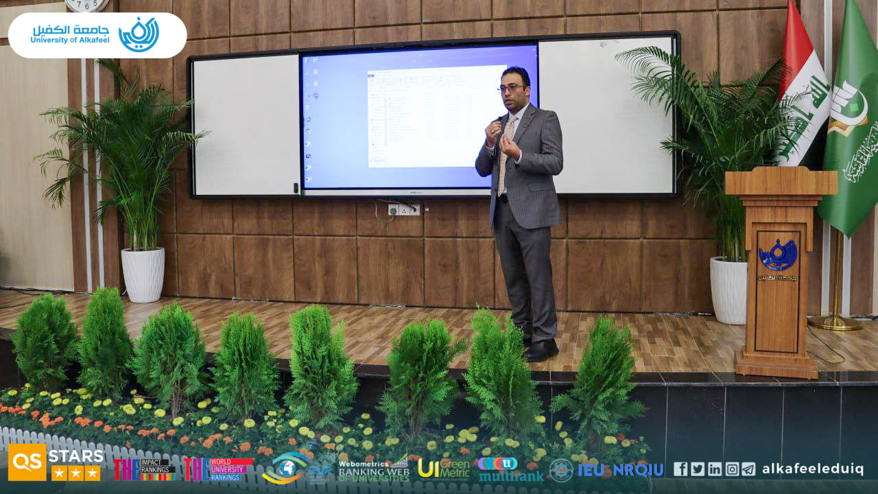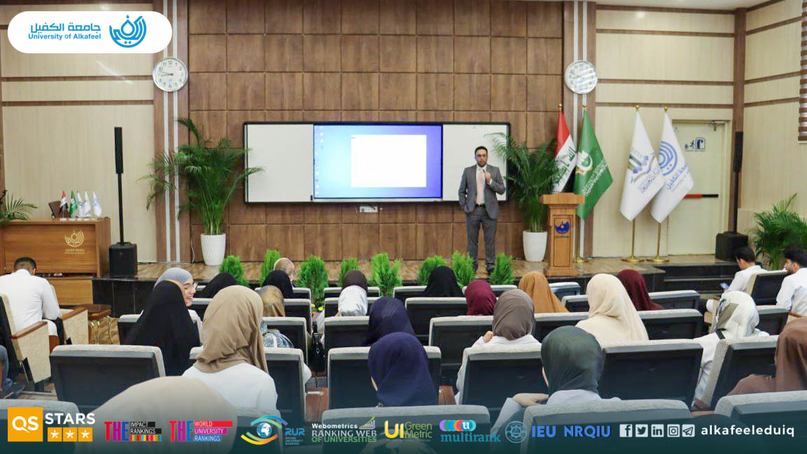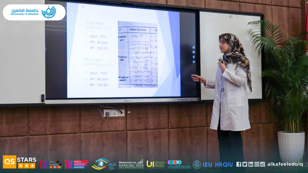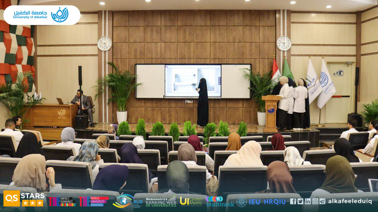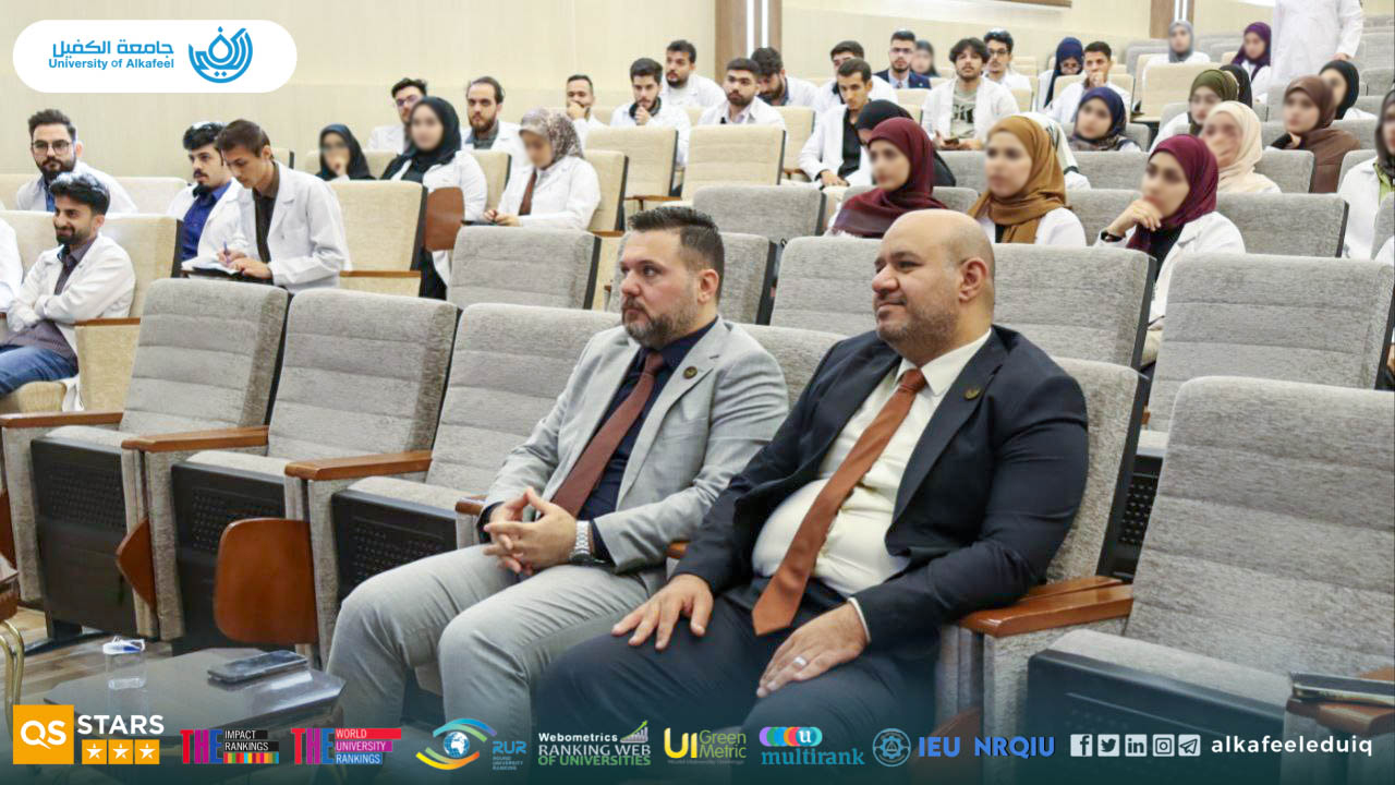 The discussion was presented by Instructor Ahmed Kadhim Al-Jalihaoui and Clinical Pharmacist Maryam Haider Abdul Redha, under the direct supervision of the Dean of the College, at the College of Medicine, and in the presence of the participating students.