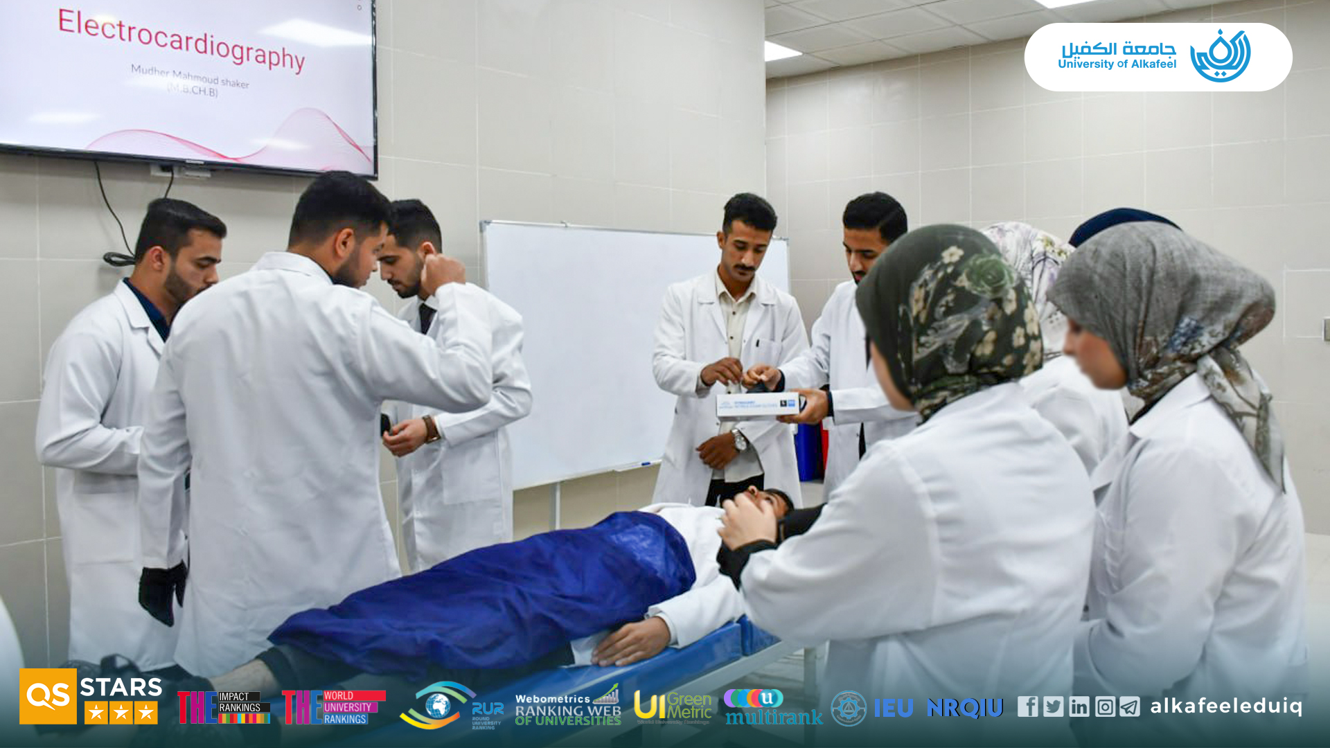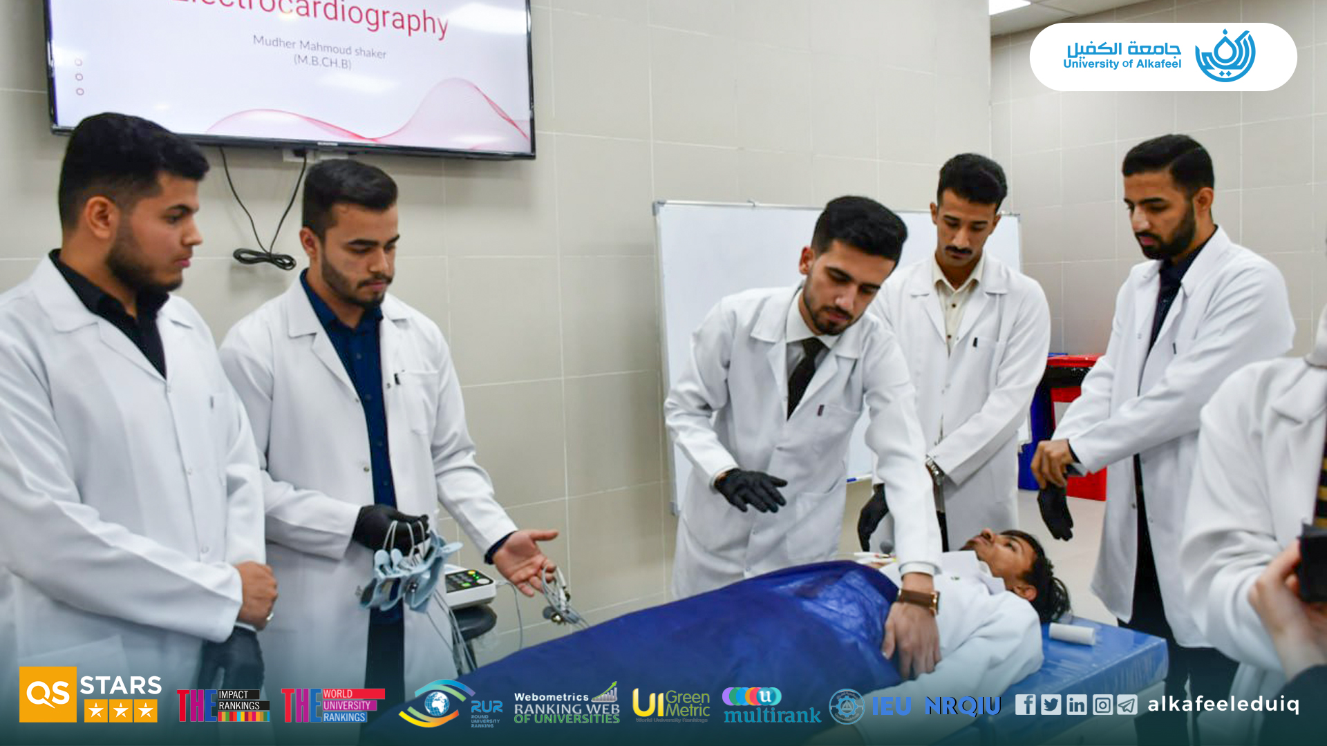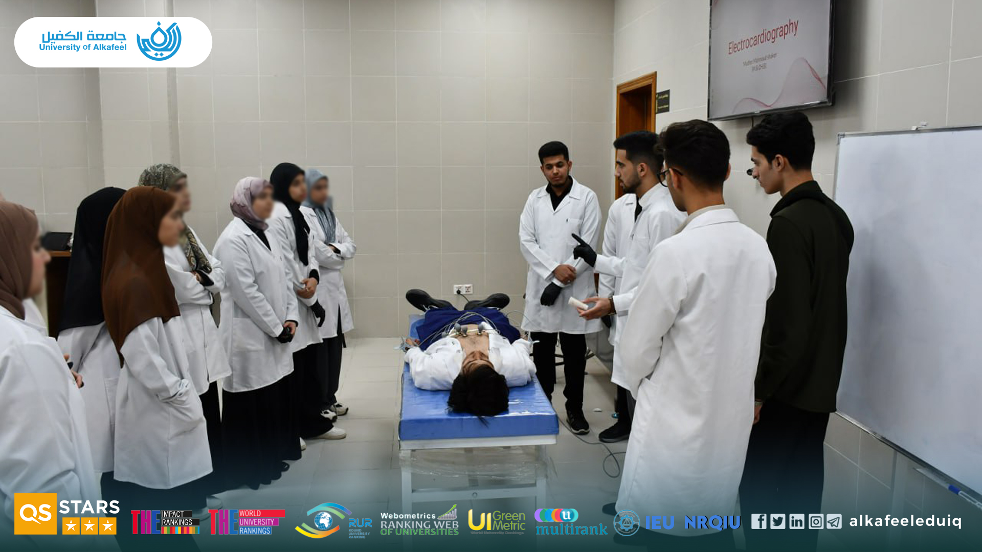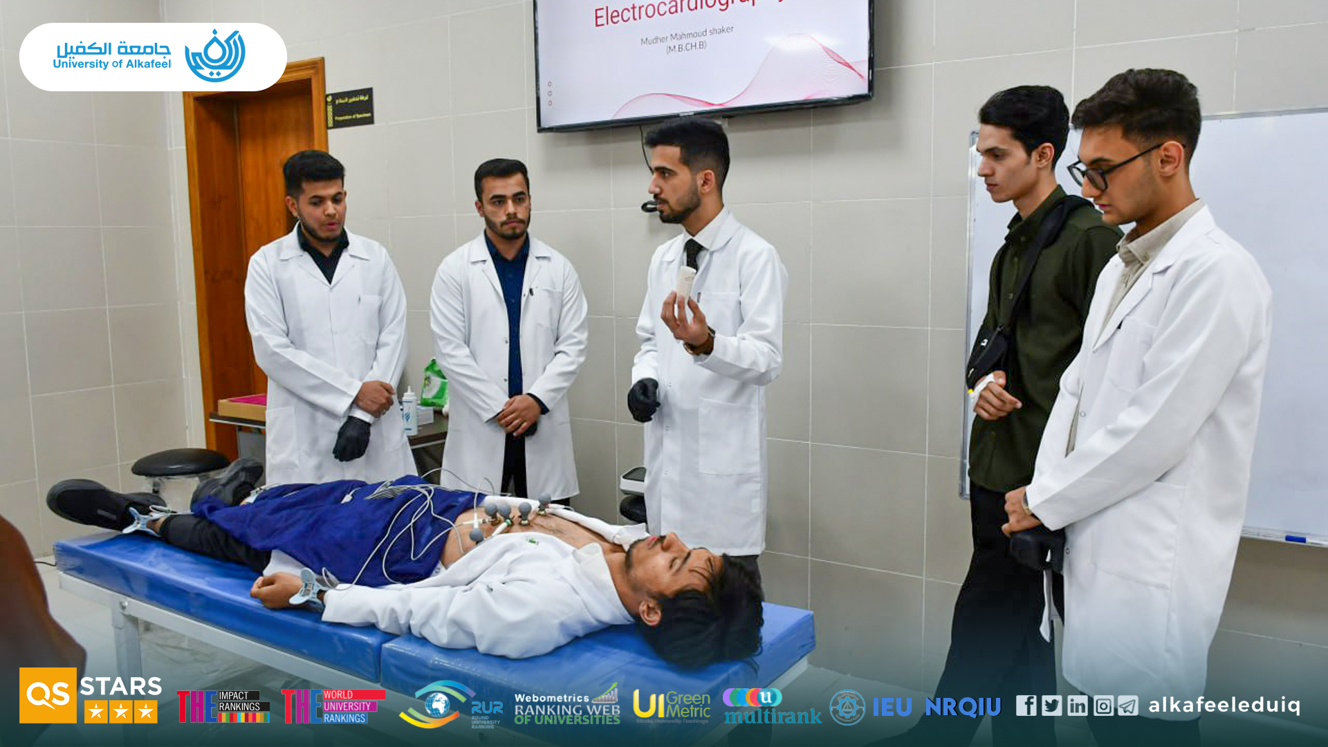 The Anesthesia Technology Department organized a specialized training workshop for its students on Tuesday, 4 November 2025, focusing on the operation of the electrocardiogram (ECG) machine. The workshop was supervised by Asst.Resh. Mudhar Mahmoud Shaker , aimed to introduce students to the fundamental principles of the device and develop their skills in reading and analyzing ECGs and also provided training on the proper and safe connection of electrodes and operation of the machine in a clinical setting. There were a theoretical component explaining cardiac waves and their components, a practical session on electrode placement, machine operation, and professional interpretation of results. This practical application enhanced the understanding of the students on the precise clinical practices.