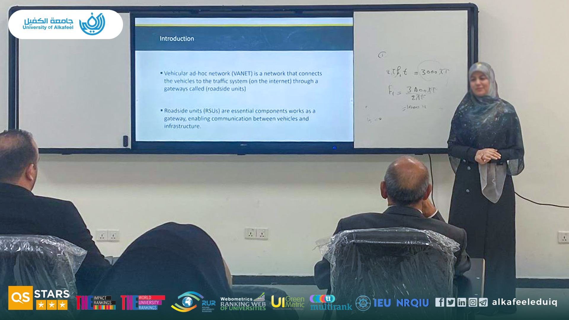 The Department of Artificial Intelligence at the College of Science, University of Alkafeel , held a workshop titled "Artificial Intelligence in Vehicular Ad Hoc Networks (VANETs)" on Sunday, November 16, 2025. The workshop was presented by Asst. Lect. Fatima Tahseen Ali.