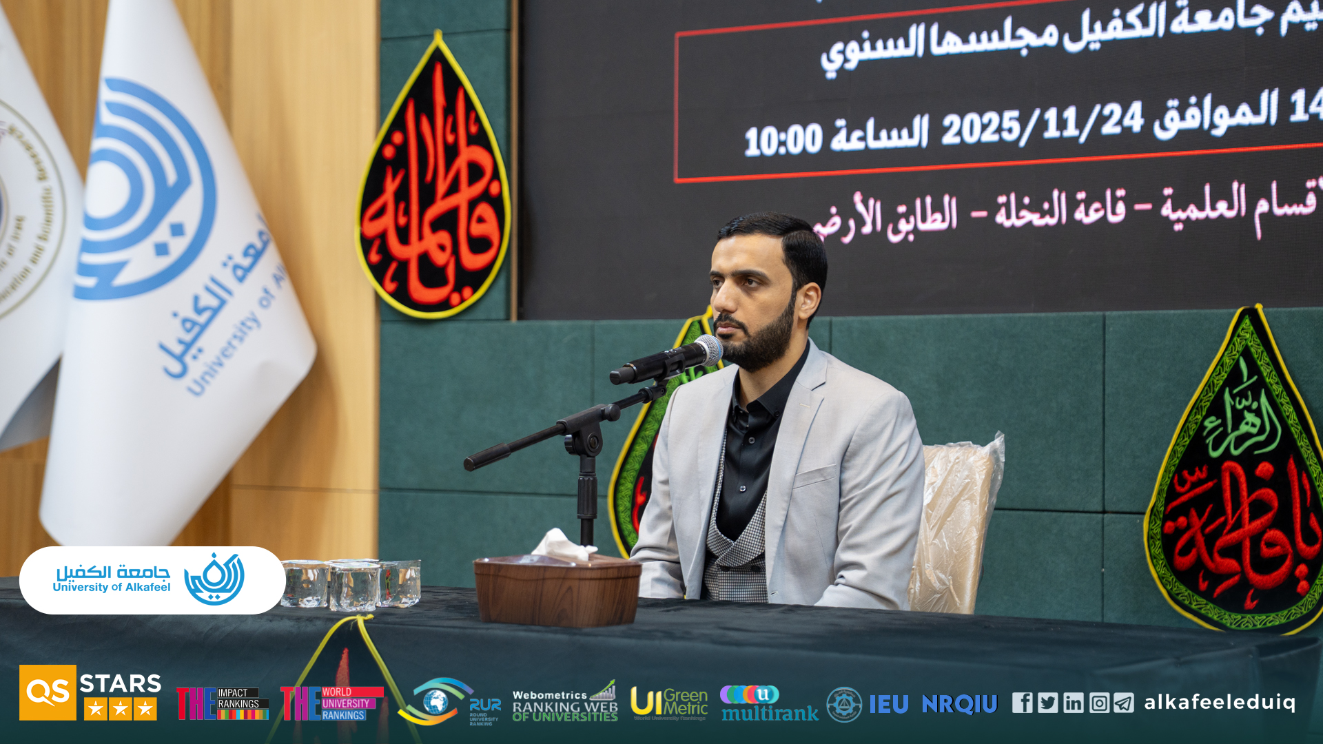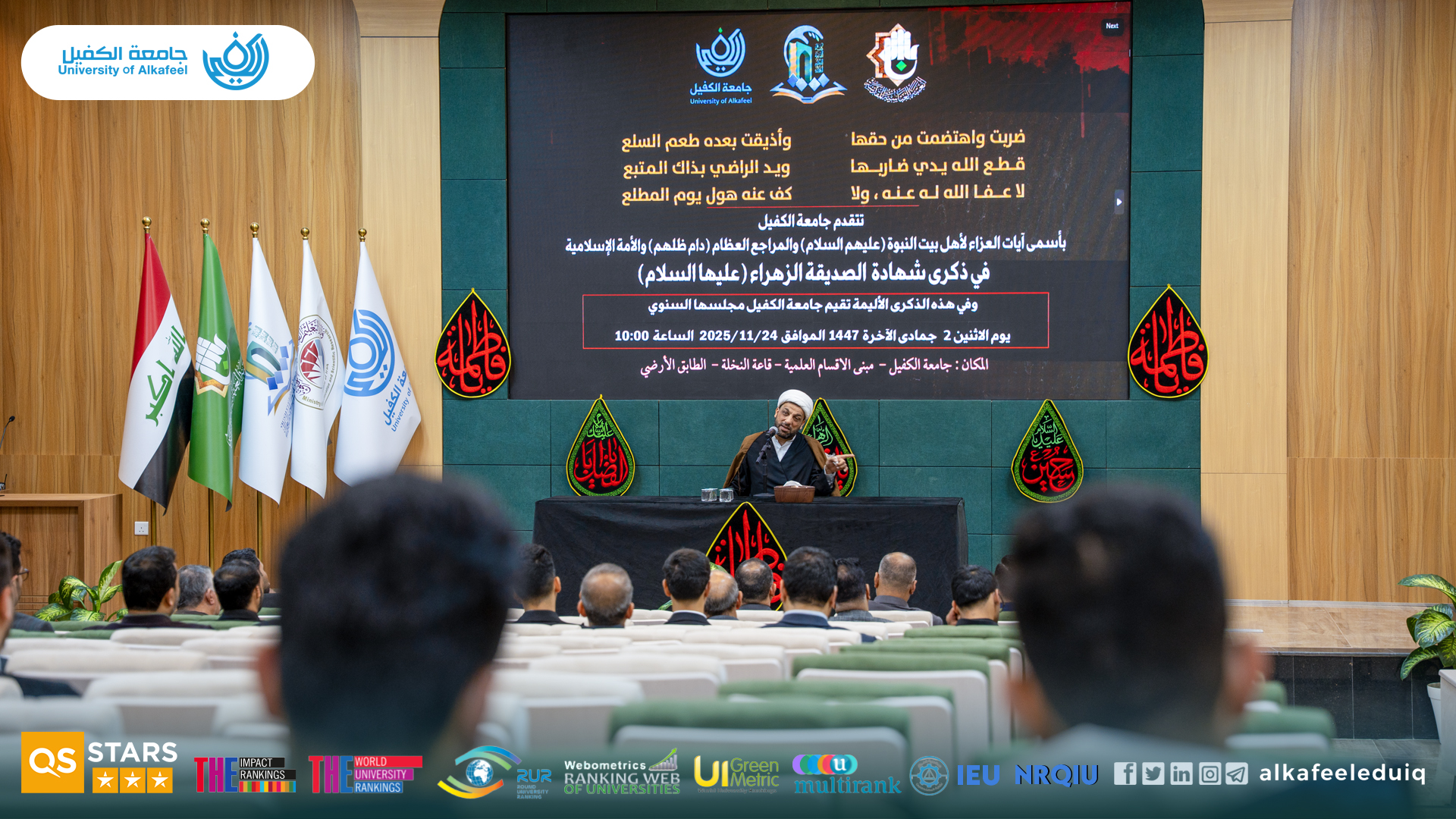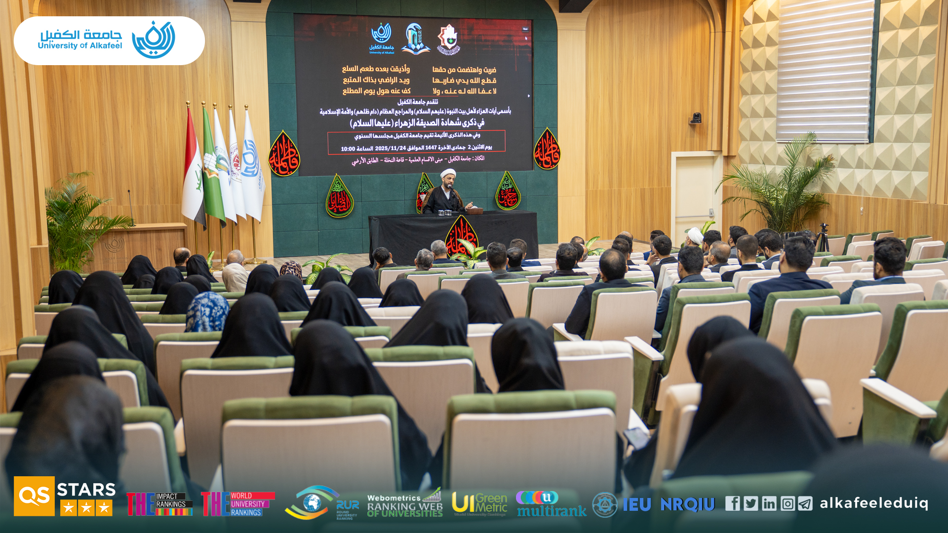 University of Alkafeel held its annual mourning ceremony to commemorate the martyrdom of Seida. Fatima al-Zahra (peace be upon her) on Monday, 24 November 2025. The ceremony was attended by the University President, Prof.Dr. Nawras Muhammad Shaheed Al-Dahan, deans, faculty members, and a large number of students.
