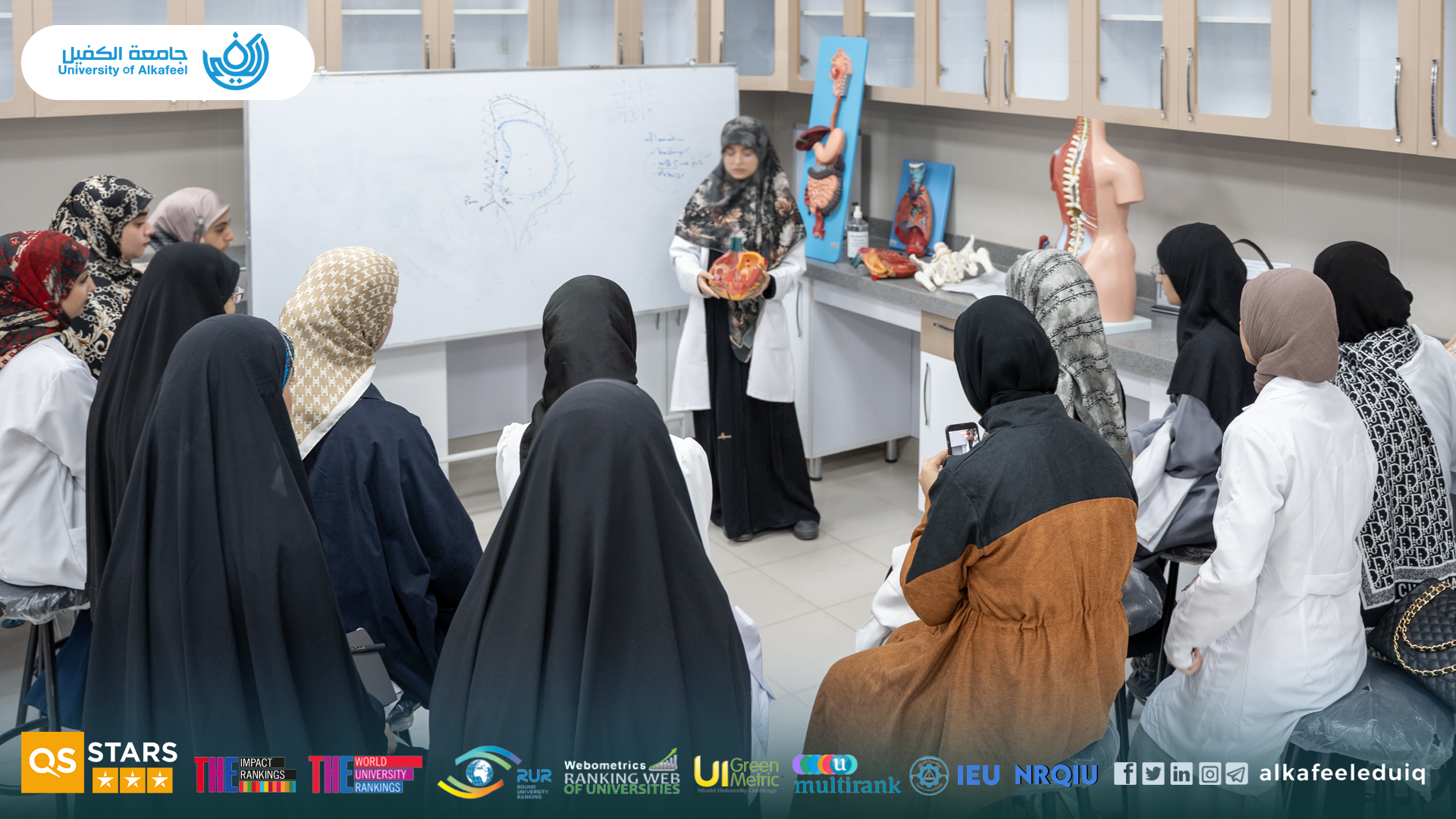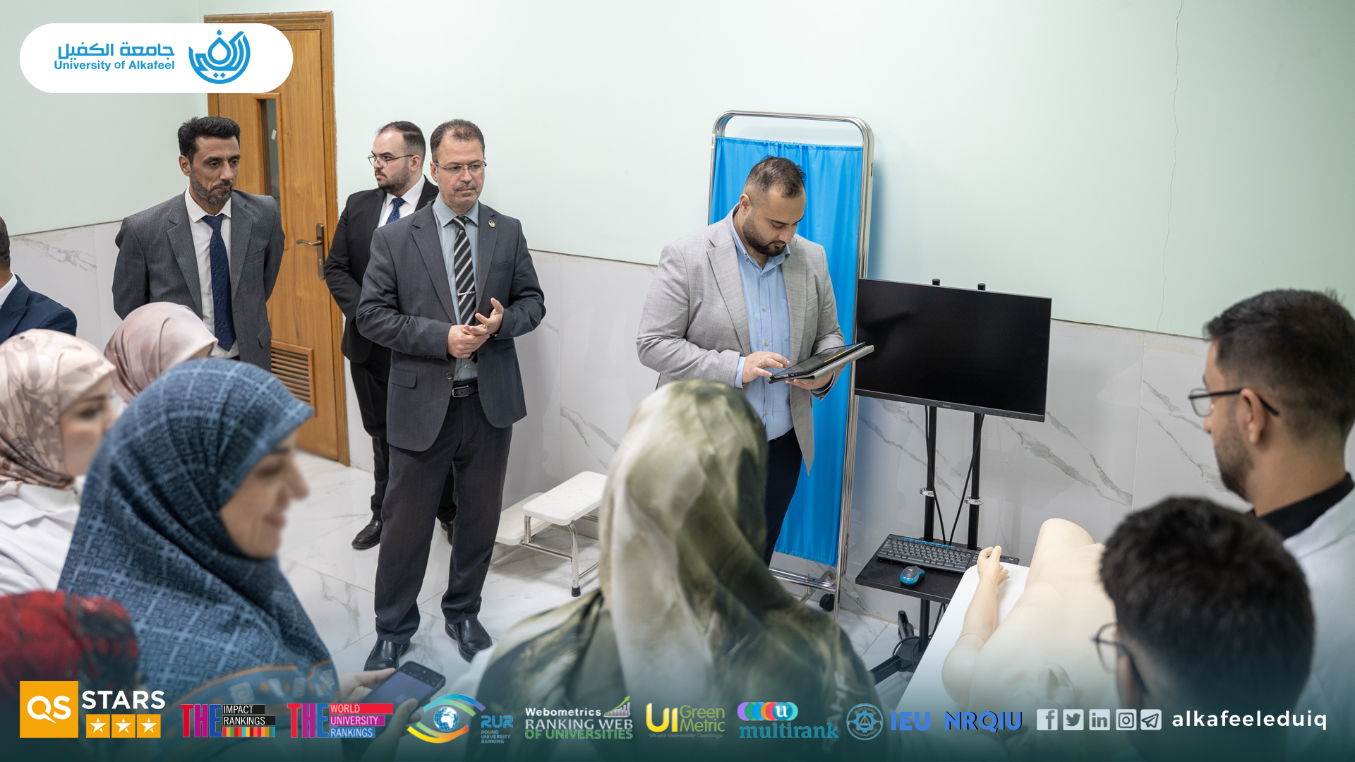 The delegation, accompanied by the Dean of the College of Medicine at Al-Kafeel University, Dr. Samer Makki Al-Hakkak, toured the college facilities to have a glance over its infrastructure and specialized laboratories : the anatomy lab, where an introductory lecture was given on the work mechanisms, and a visit to the clinical skills lab to learn about the modern equipment used in training.