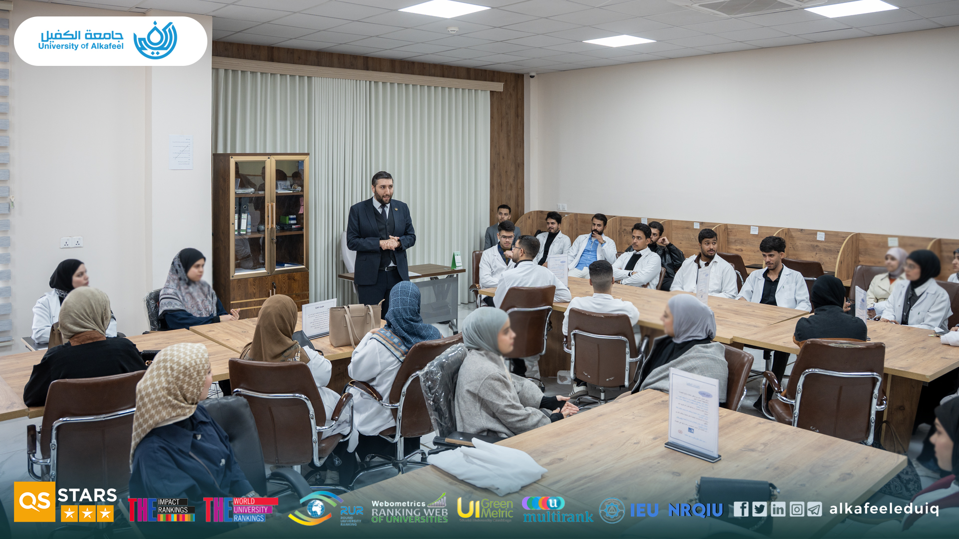 The College of Medicine at Al-Kafeel University received a scientific delegation from the College of Science at the University of Kufa ; several professors from the Departments of Pathological Analysis and Biology, and a group of students.