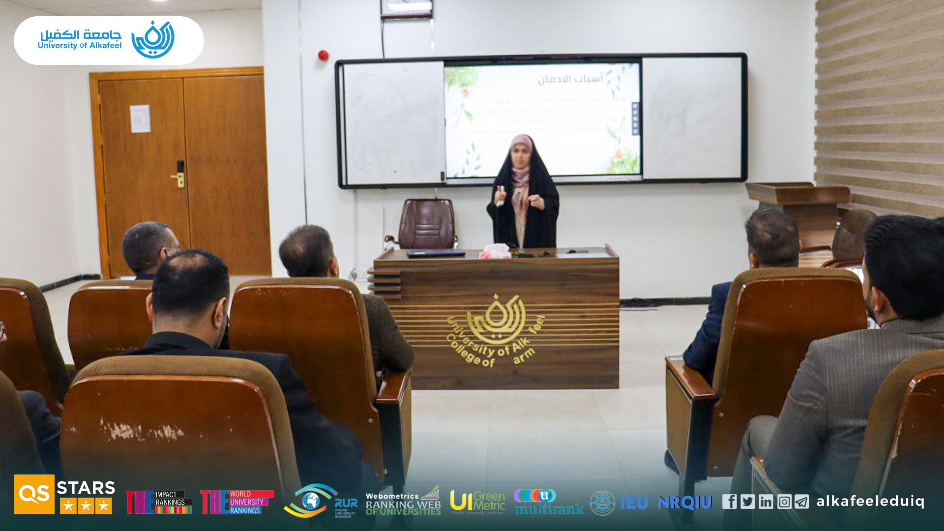 The course was presented by Asst.Lect. Rasel Hammoudi Hassan, who addressed various aspects of addiction in its different forms, particularly behavioral and chemical addiction, highlighting its psychological, social, scientific, and religious causes and its negative repercussions on the individual and society. Such an event enhances the health and cultural awareness among the participants and explains the methods of prevention, treatment, and recovery by offering practical solutions and guidance that contribute to reducing this serious phenomenon. The College of Pharmacy and its Lifelong Learning Unit are keen to show their efforts to disseminate awareness and the humanitarian and scientific role of academic institutions in addressing contemporary societal challenges.