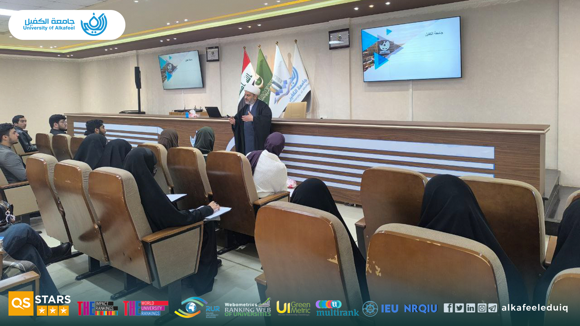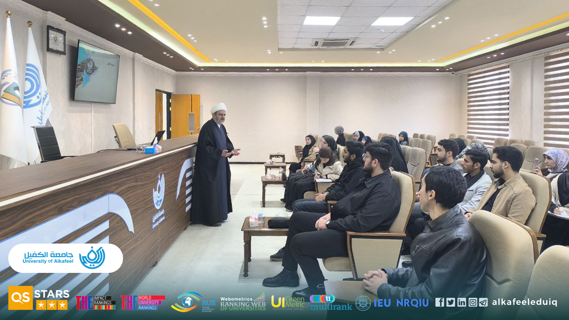 On Monday, December 15, 2025, Asst. Prof. Dr. Hussam Ali Hassan Al-Obaidi, Director of the Department of Psychological Guidance and Educational Orientation at University of Alkafeel , delivered a lecture : “ Foundations of Intellectual Fortification in Times of Contemporary Challenges." The lecture targeted students from all university colleges who wished to delve deeper into the study of matters of doctrines and faqh , based on their request.