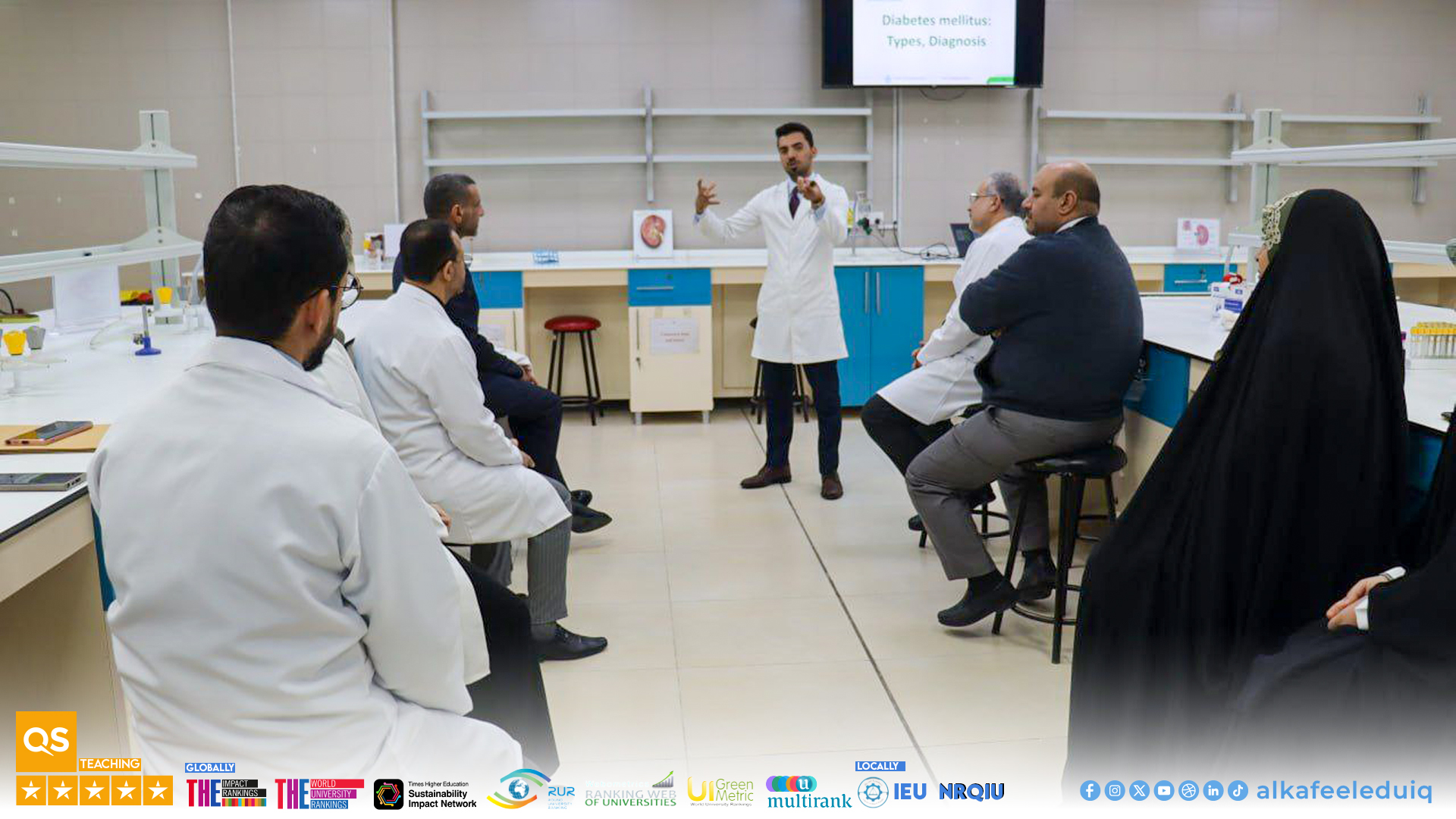 The College of Pharmacy at University of Alkafeel organized a scientific training course on diabetes, its types, and diagnostic methods. This course, held on 23 Tuesday December 2025, was part of the university programs to promote health awareness and update the scientific knowledge of students and staff. The course was held in the Medical Sciences Laboratory and presented by Asst. Lect. Murtadha Adnan Muhaysin. In the course, he reviewed the definition of diabetes and its health significance as one of the most prevalent chronic diseases, highlighting its different types, including type 1, type 2, and gestational diabetes.