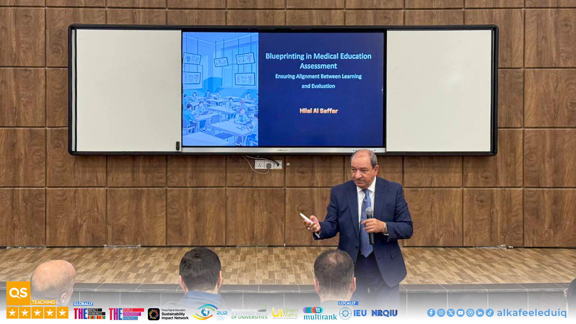 The College of Medicine at University of Alkafeel held an advanced scientific workshop : “Assessment Blueprinting,” led by Professor Dr. Hilal Al-Saffar, Advisor to the President of University of Alkafeel on Medical Education, on Tuesday, 30 December 2025. The workshop aimed to develop the skills of teaching staff members in the field of assessment and examinations, ensuring that assessments align with learning outcomes according to modern academic standards and achieving fairness and objectivity in assessing the competence of the students .