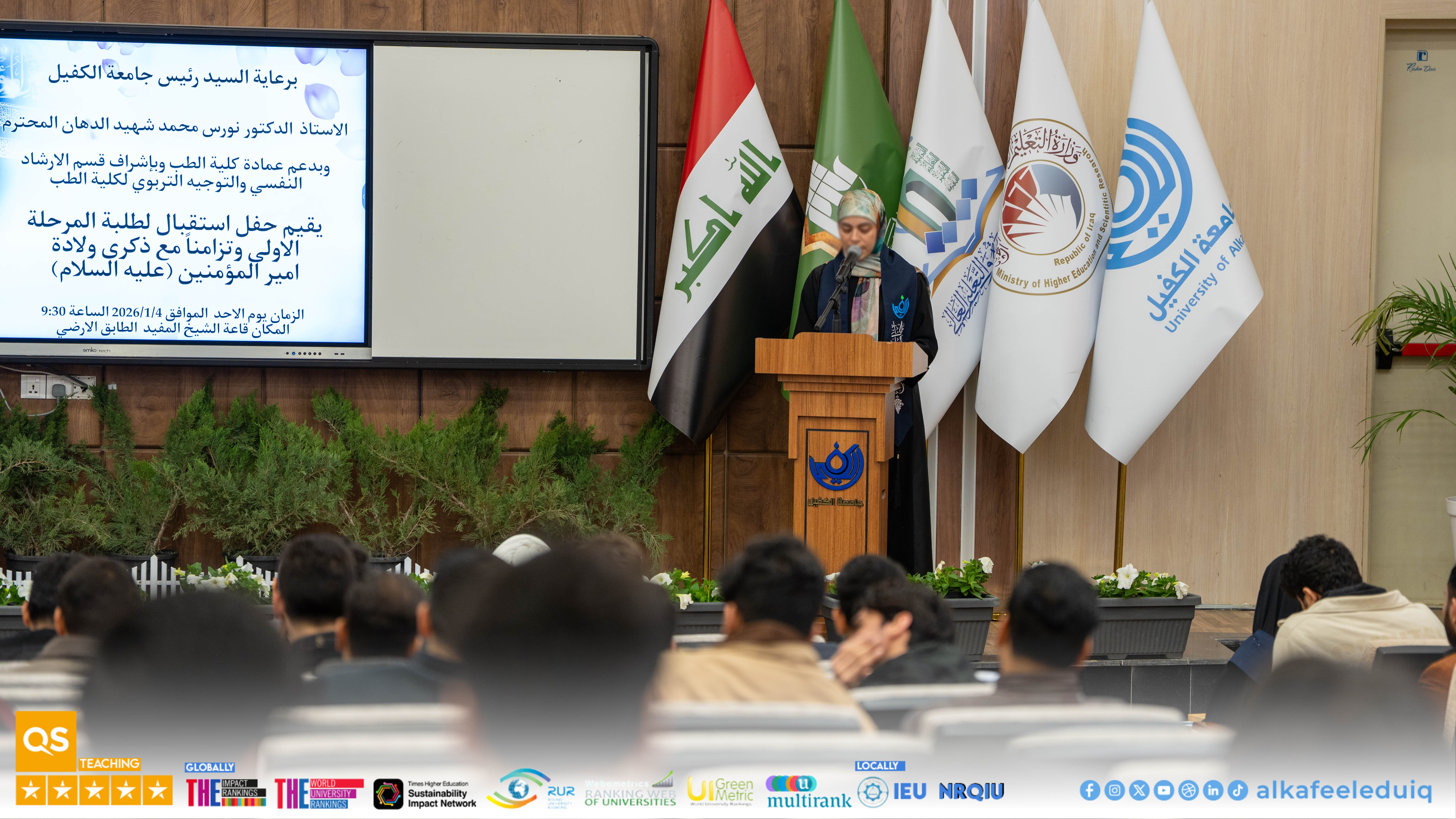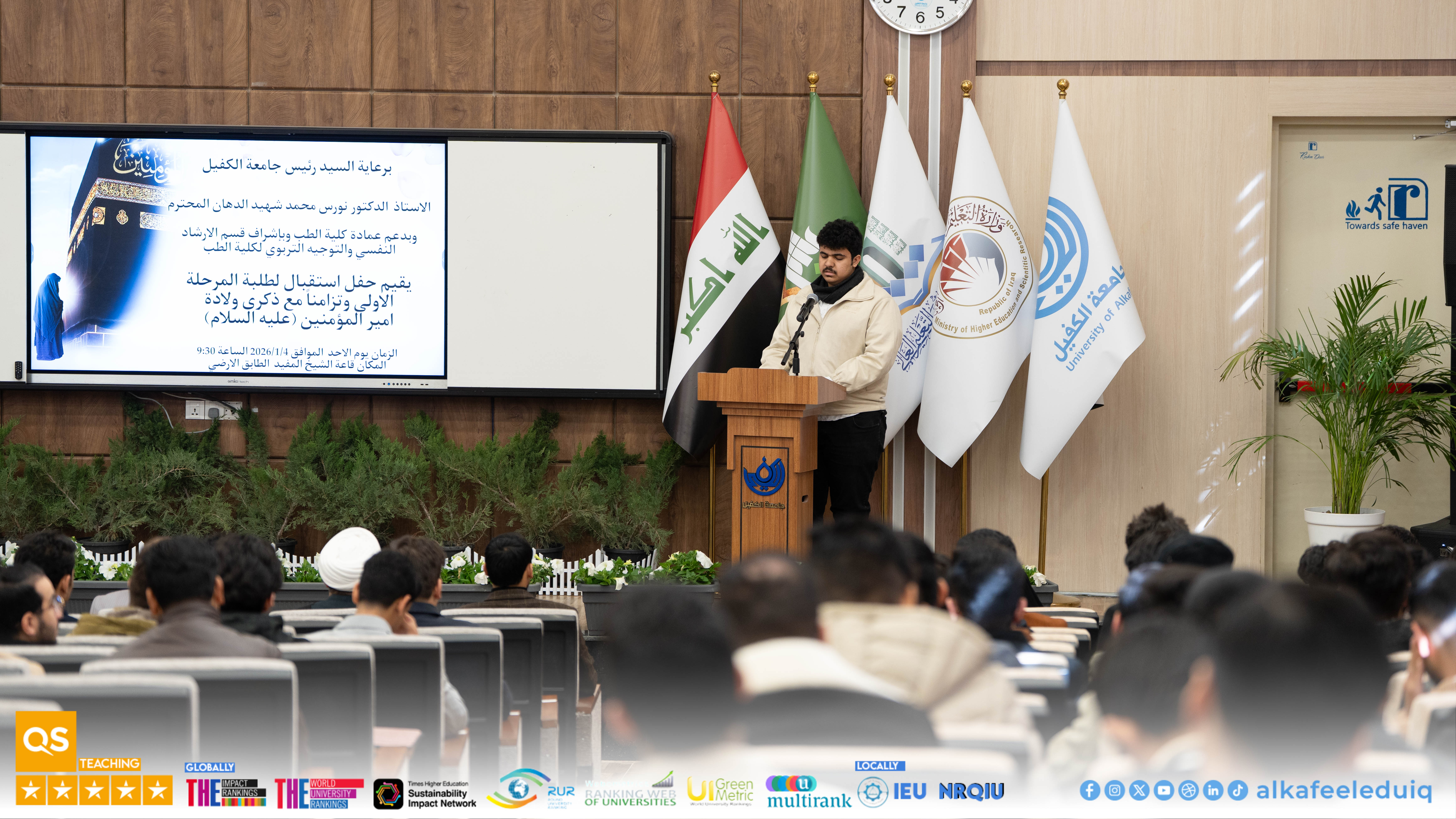Under the patronage of Prof.Dr. Nawras Muhammed Shaheed Al-Dahan, President of University of Alkafeel , the College of Medicine, in cooperation with the Department of Psychological Guidance and Educational Orientation at University of Alkafeel , held a welcoming ceremony for the medical freshman students, coinciding with the birth anniversary of Imam Ali ibn Abi Talib (peace be upon him), the Commander of the Faithful.