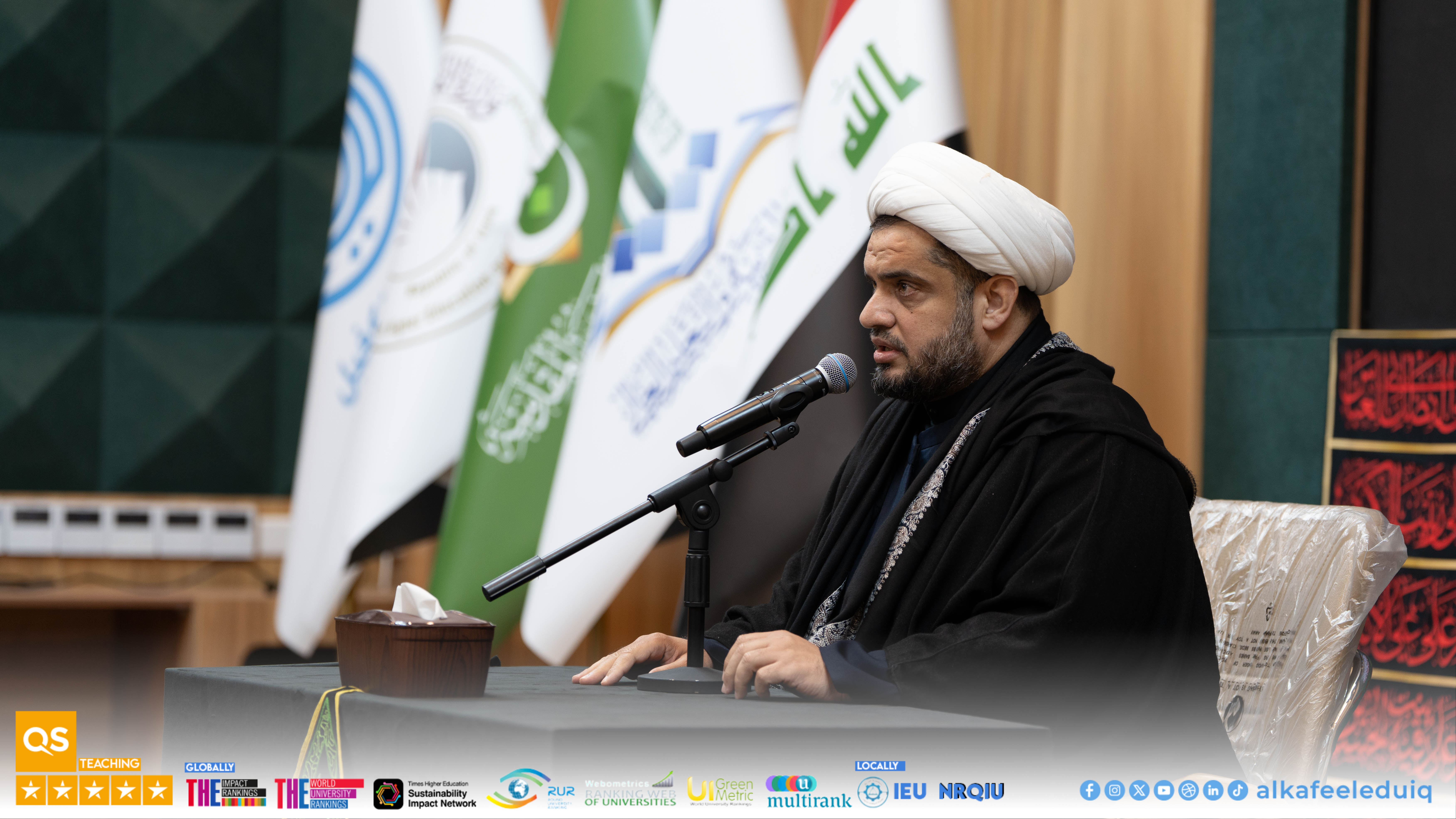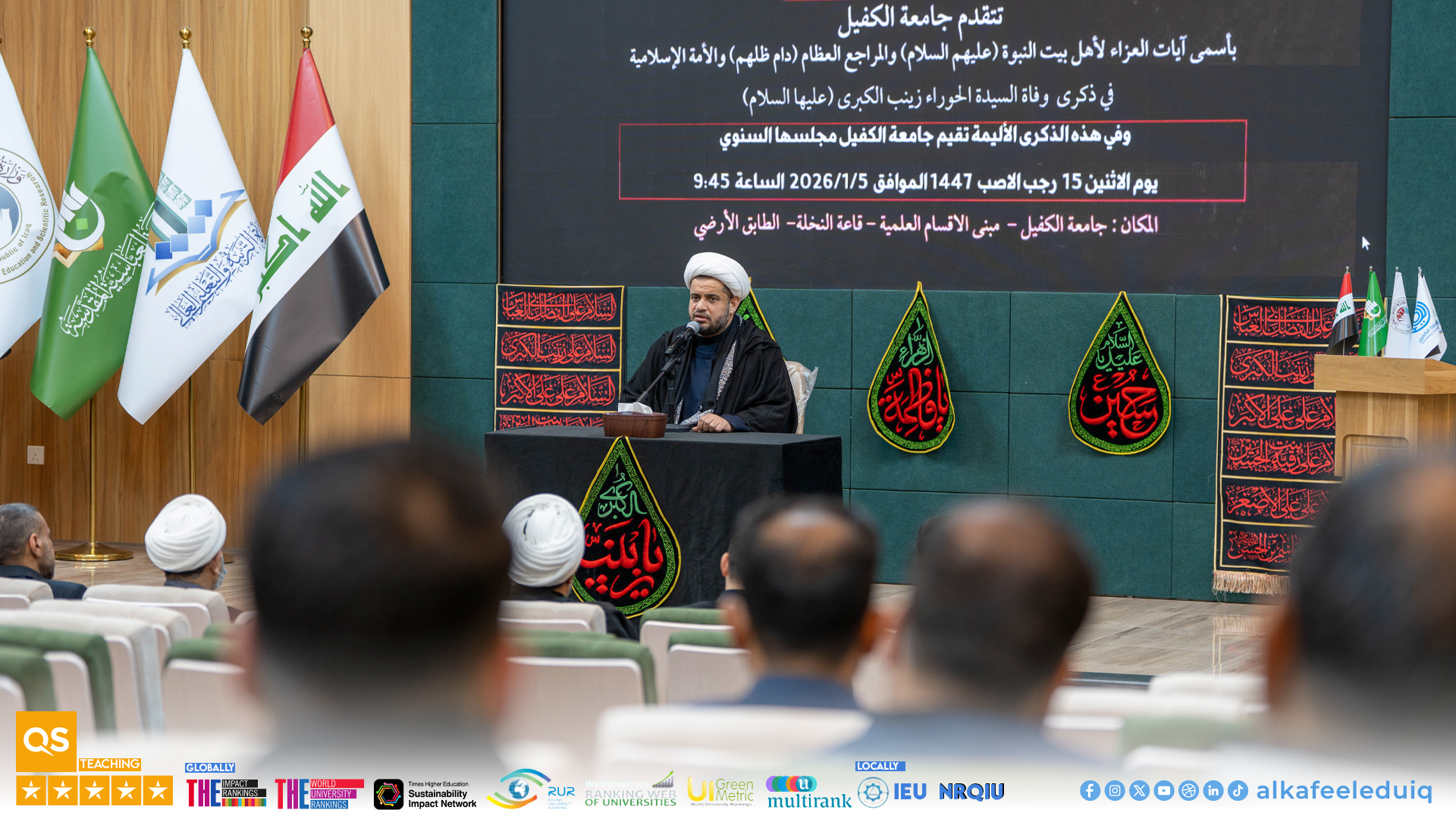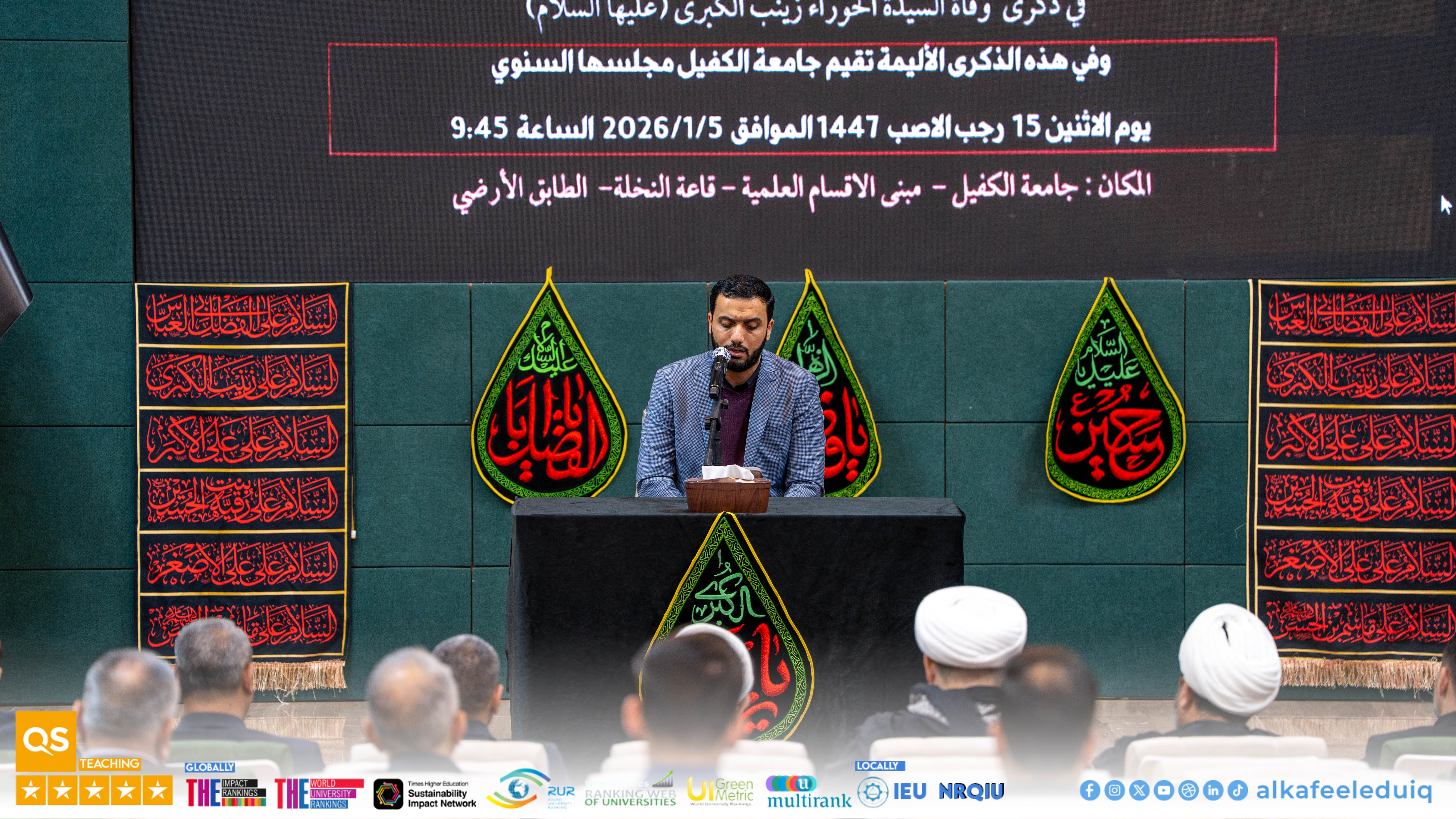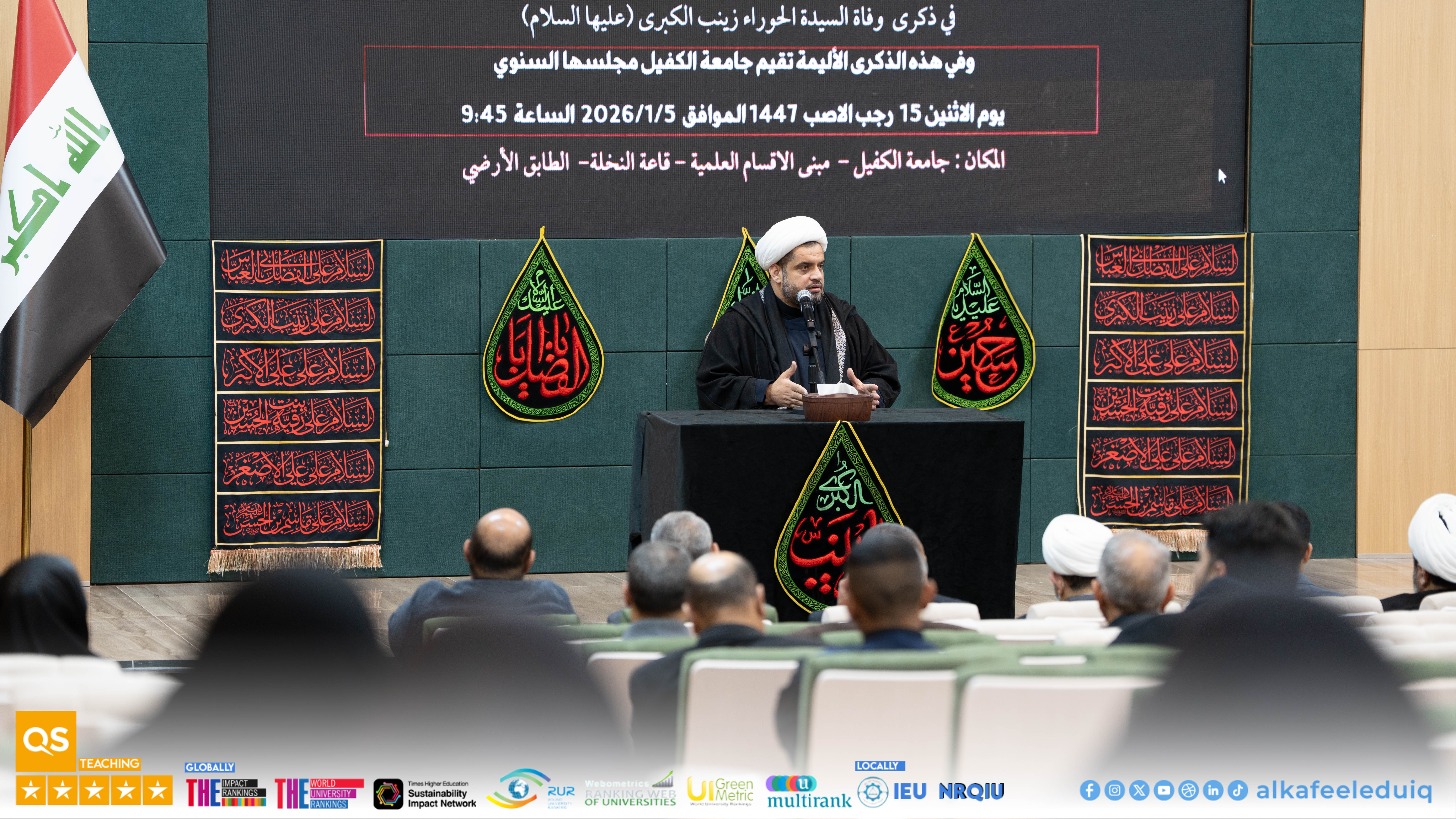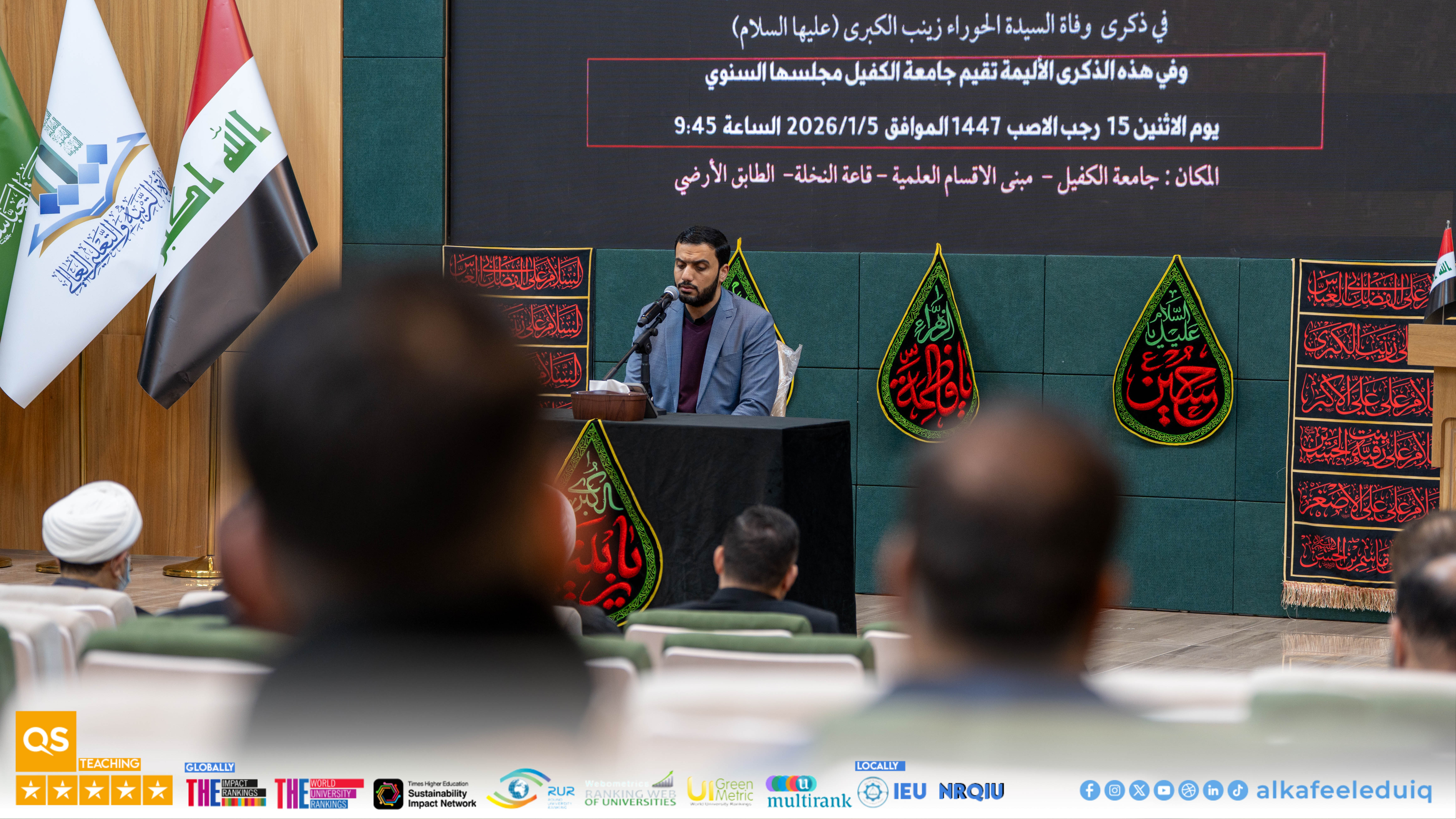 On Monday morning, 5 January 2026, the Department of Psychological Guidance and Educational Orientation at University of Alkafeel organized a commemoration ceremony to mark the martyrdom anniversary of Seida. Zaynab al-Kubra (peace be upon her). The ceremony was attended by the University President, Prof.Dr. Nawras Muhammed Shaheed Al-Dahan, along with several deans, faculty members, and staff. The ceremony began with a recitation from Glorious Quran by Seid. Muhannad al-Mayali from the Institute of Glorious Quran , pertinent to Holy Abbas Shrine in Najaf, which gave a spiritual atmosphere to the occasion.