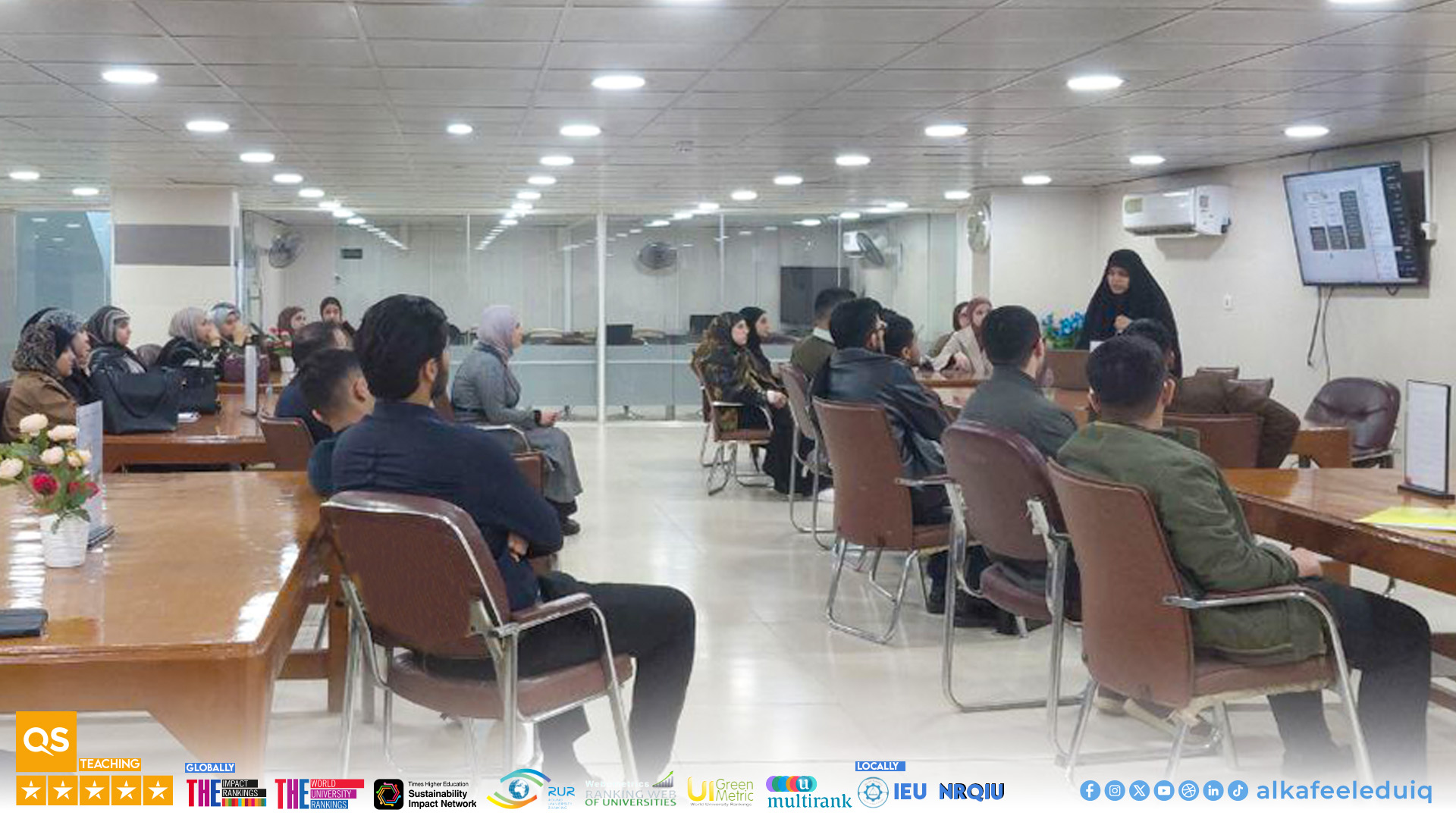 The workshop was led by Lect. Narjis Ghalib, Head of the Central Library, and Ms. Dhikra Abdul Aziz, who provided the students with a detailed explanation of how to use the electronic catalog and access various scientific and academic resources.