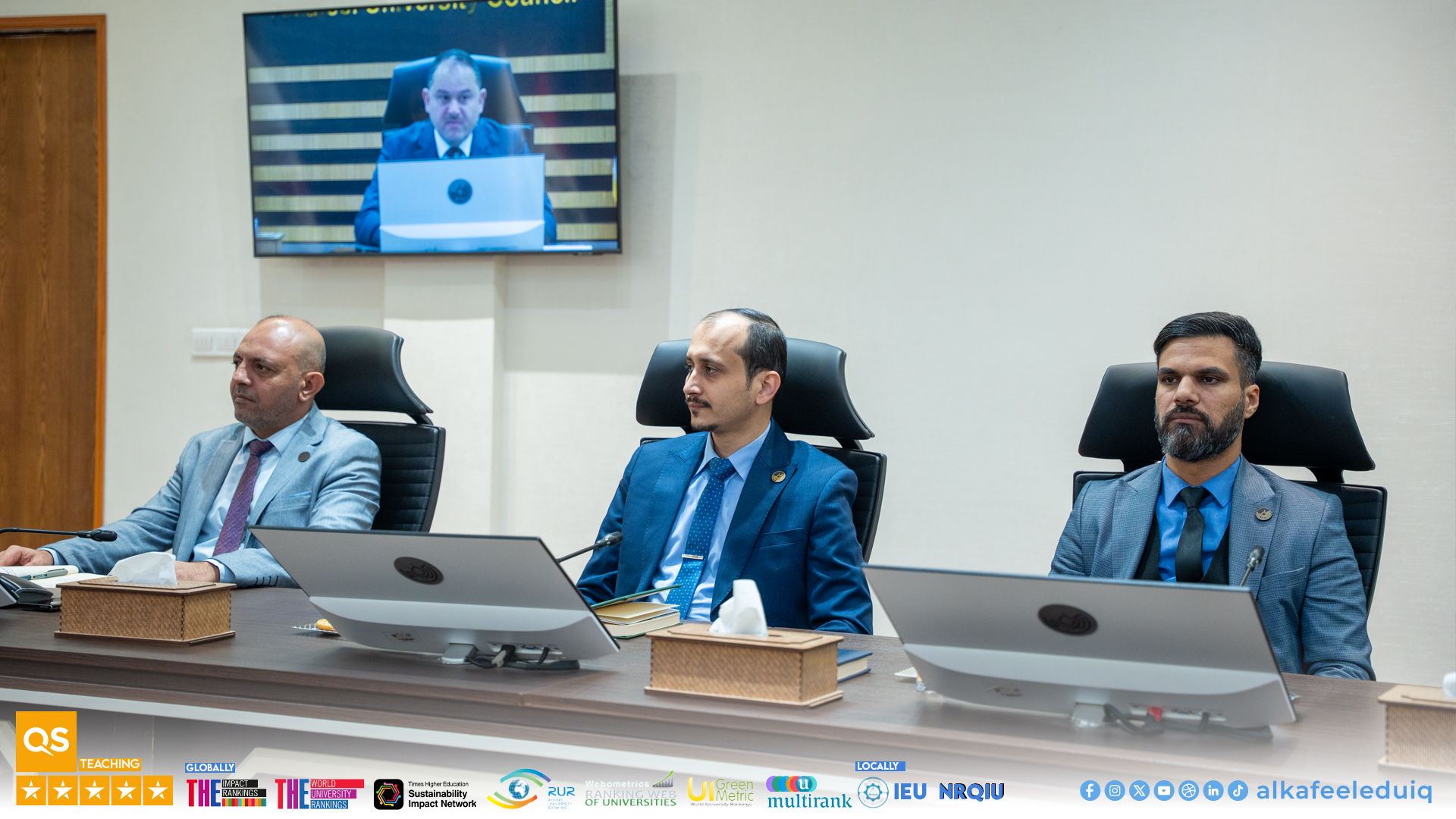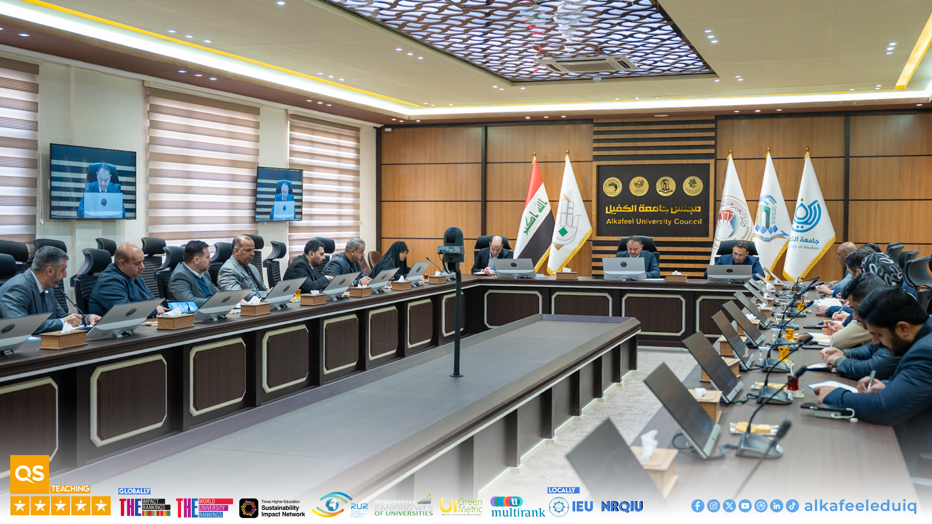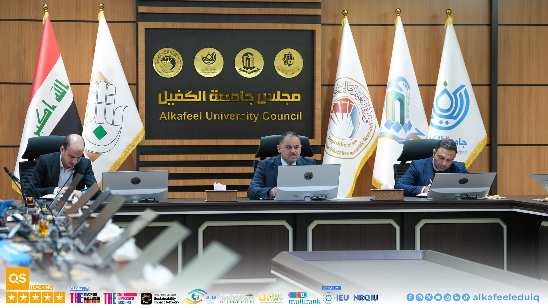 University of Alkafeel Council held its regular meeting for 2025-2026 academic year, chaired by the University President, Prof.Dr. Nawras Muhammed Shaheed Al-Dahan, and attended by the Vice-Chancellor for Scientific Affairs, Prof. Dr. Nawal Ayed Al-Mayali, the deans and assistant deans of the colleges.