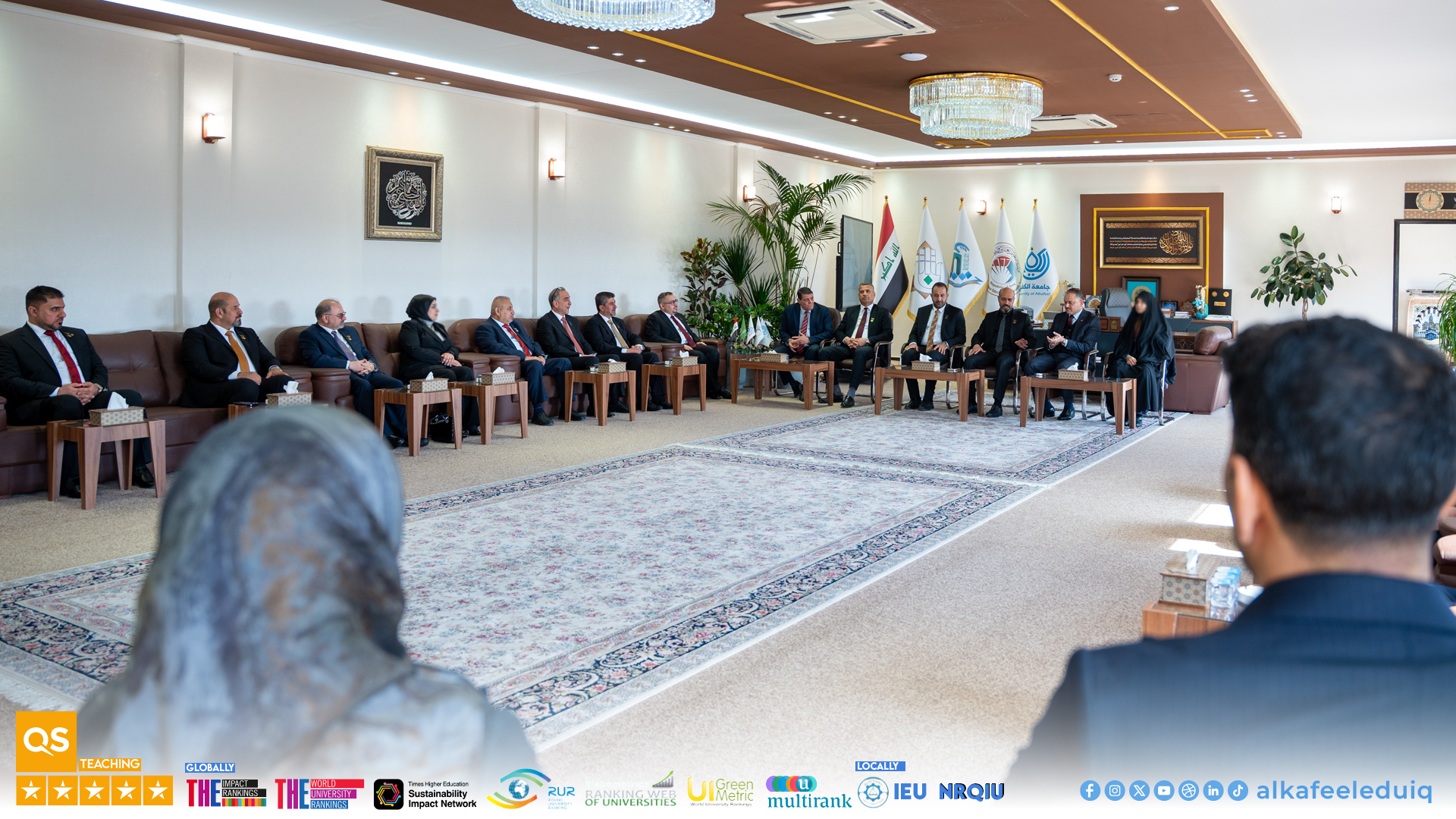 Prof.Dr. Nawras Muhammed Shaheed Al-Dahan, President of University of Alkafeel , and Prof.Dr. Nawal Ayed Al-Mayali, Vice-Chancellor for Scientific Affairs, and the members of the University of Alkafeel Council, received an official delegation from Al-Ayen University, headed by Prof.Dr. Haider Abdul-Amir Al-Khafaji, President of Al-Ayen University. The delegation included members of the University Council. The meeting took place on Tuesday, January 27, 2026, to discuss prospects for joint collaboration between the two universities.