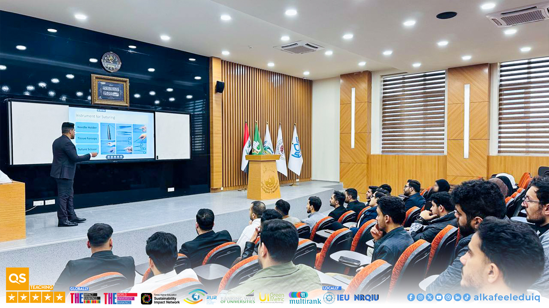 The College of Dentistry at University of Alkafeel organized a workshop : "Principles of Wound Suturing in Dental Practice," supervised by Asst. Prof. Dr. Ghassan Nazik Al-Da'mi, during the spring break. The workshop aimed to enhance the practical skills of fourth- and fifth-year dental students in wound suturing in the clinical practice of dentistry, strengthening the practical application and the theoretical knowledge.