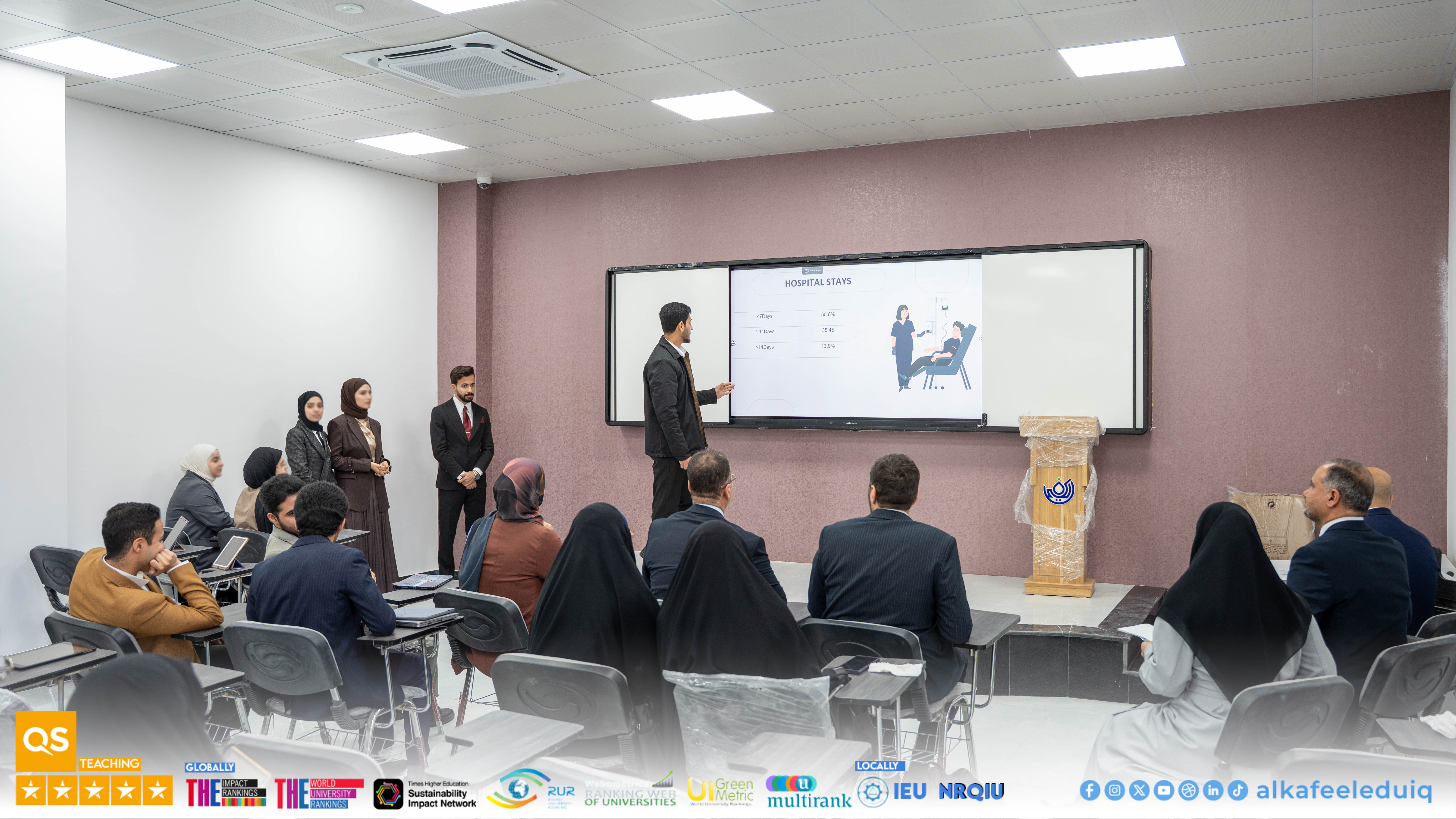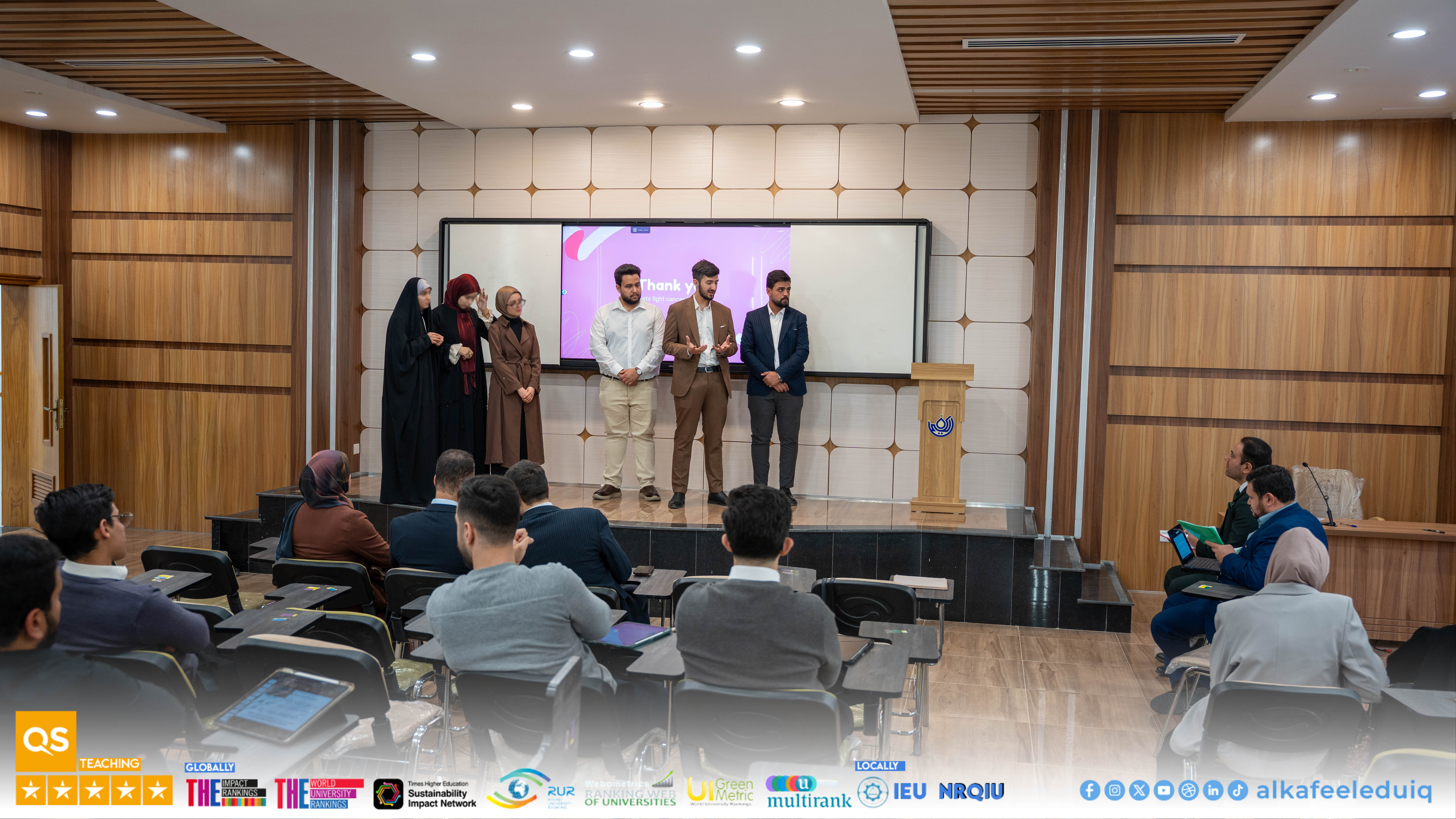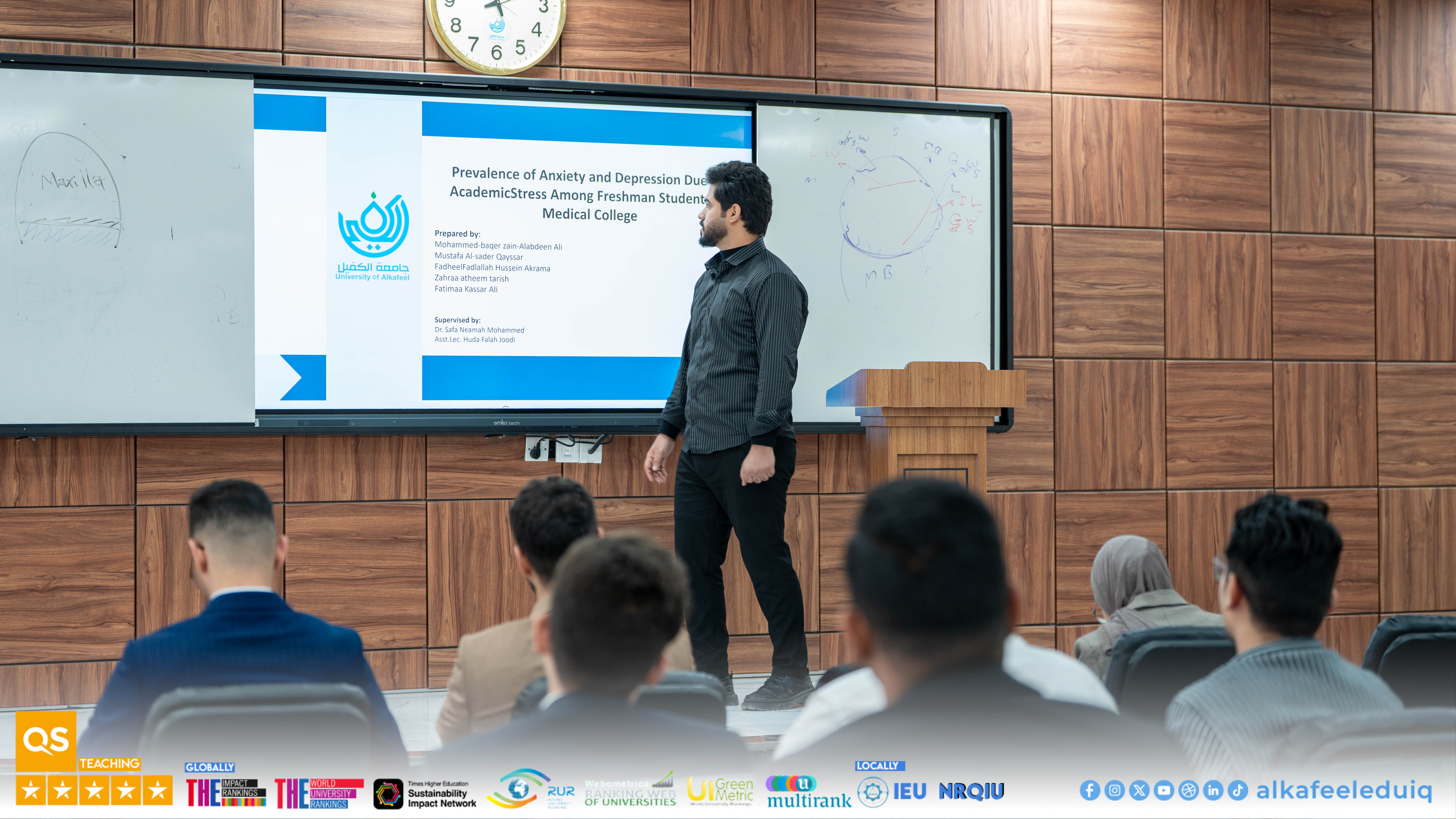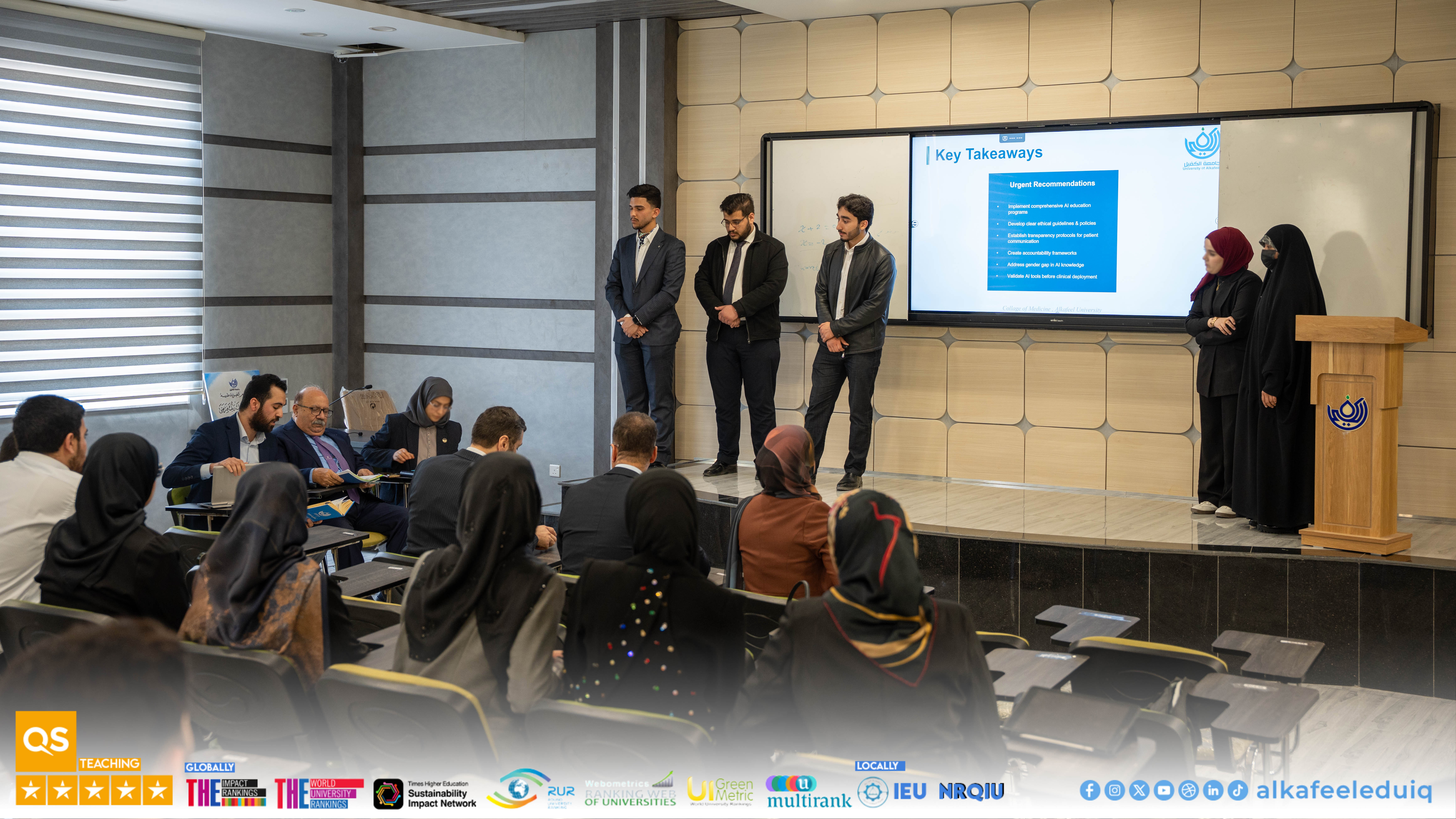 On Monday, 23 February 2026, the College of Medicine at University of Alkafeel held the research papers discussions of fourth-year medical students. The discussions were attended by Asst. Prof. Dr. Samer Maki Al-Hakak, Dean of the College of Medicine, and his deputies for scientific and administrative affairs. This important scientific step embodies the college mission to prepare physician-researchers capable of critical thinking and effective scientific contribution.