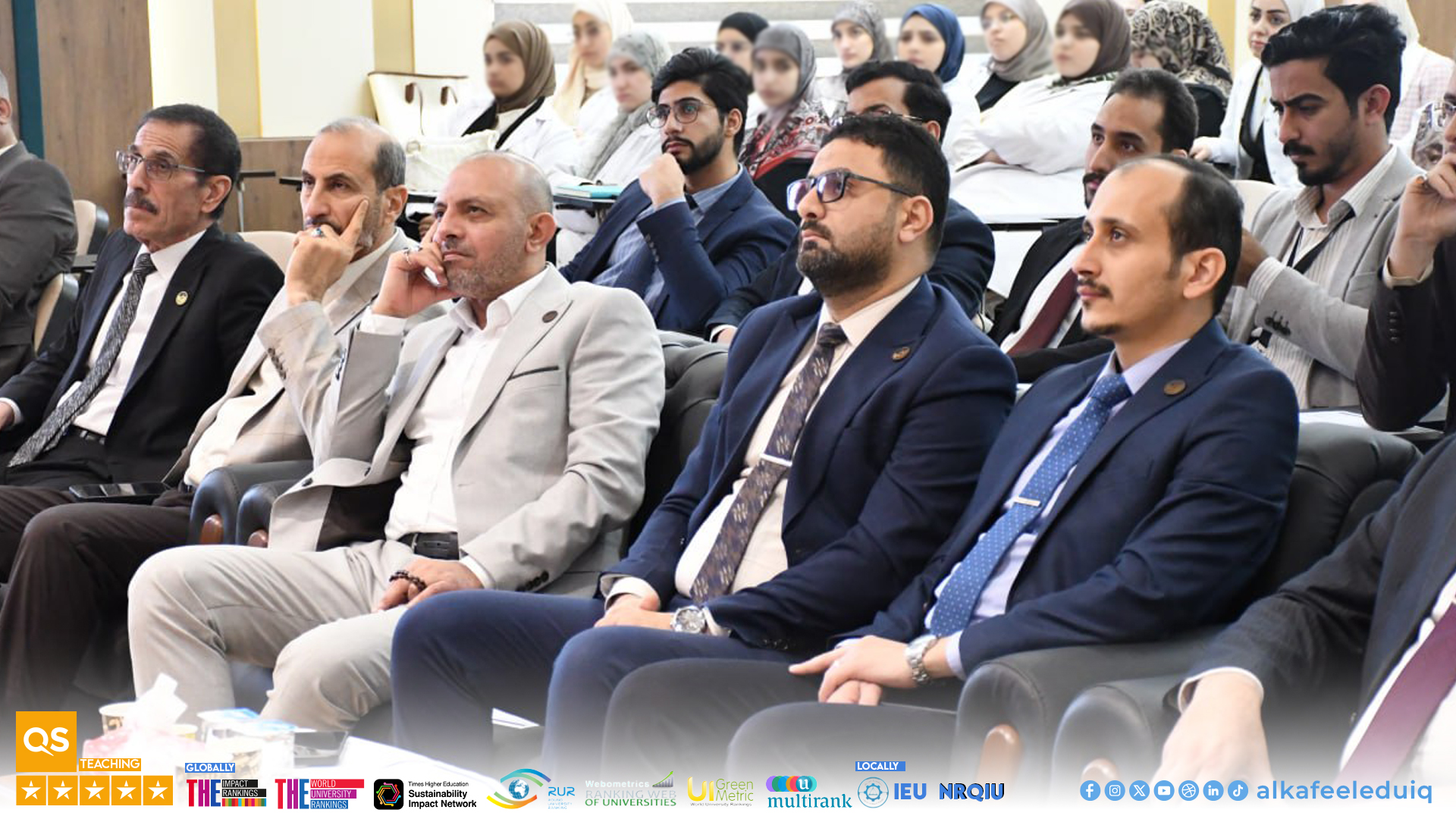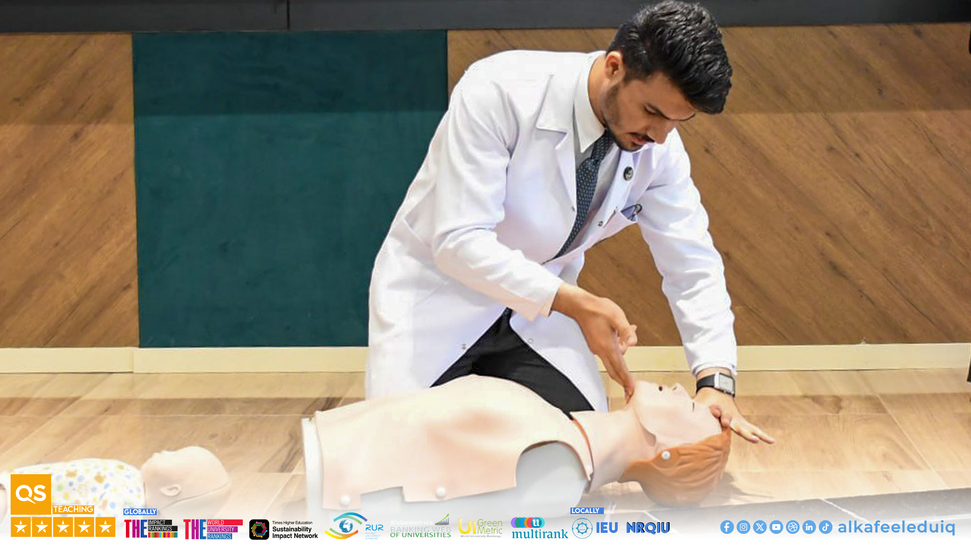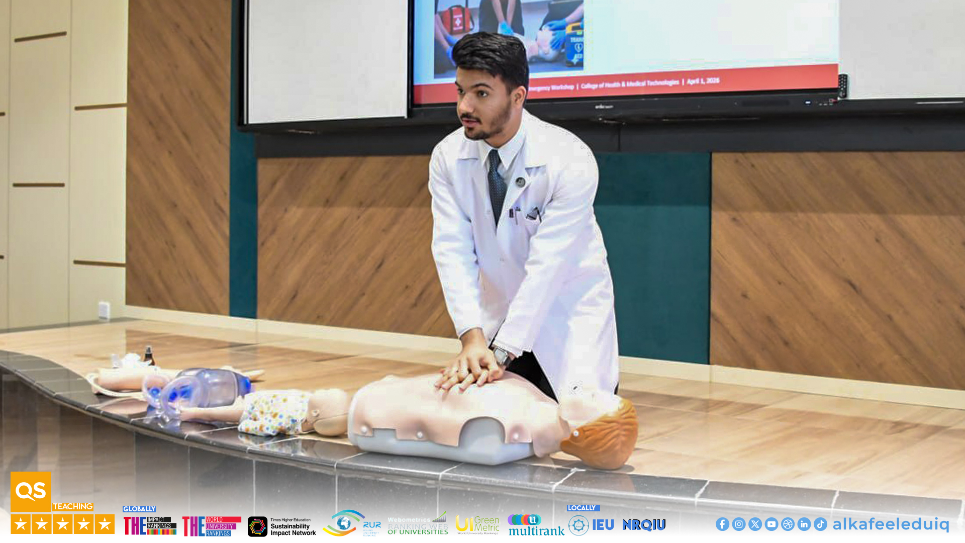 The Departments of Cardiac Care Technologies and Cosmetic and Laser Technologies at the College of Medical and Health Technologies at University of Alkafeel organized a workshop : “First Aid and Emergencies” with the participation of a number of students and faculty members on Wednesday, 1 April 2026. In attendance were the Dean of the College, Prof. Dr. Fadhil Ismail Sharad, the Vice-Dean for Scientific Affairs, Asst.Prof. Dr. Sadiq Ghani Al-Mahna, and the Vice-Dean for Administrative Affairs, Asst.Prof. Dr. Amir Sadiq Yasser Al-Adhari.