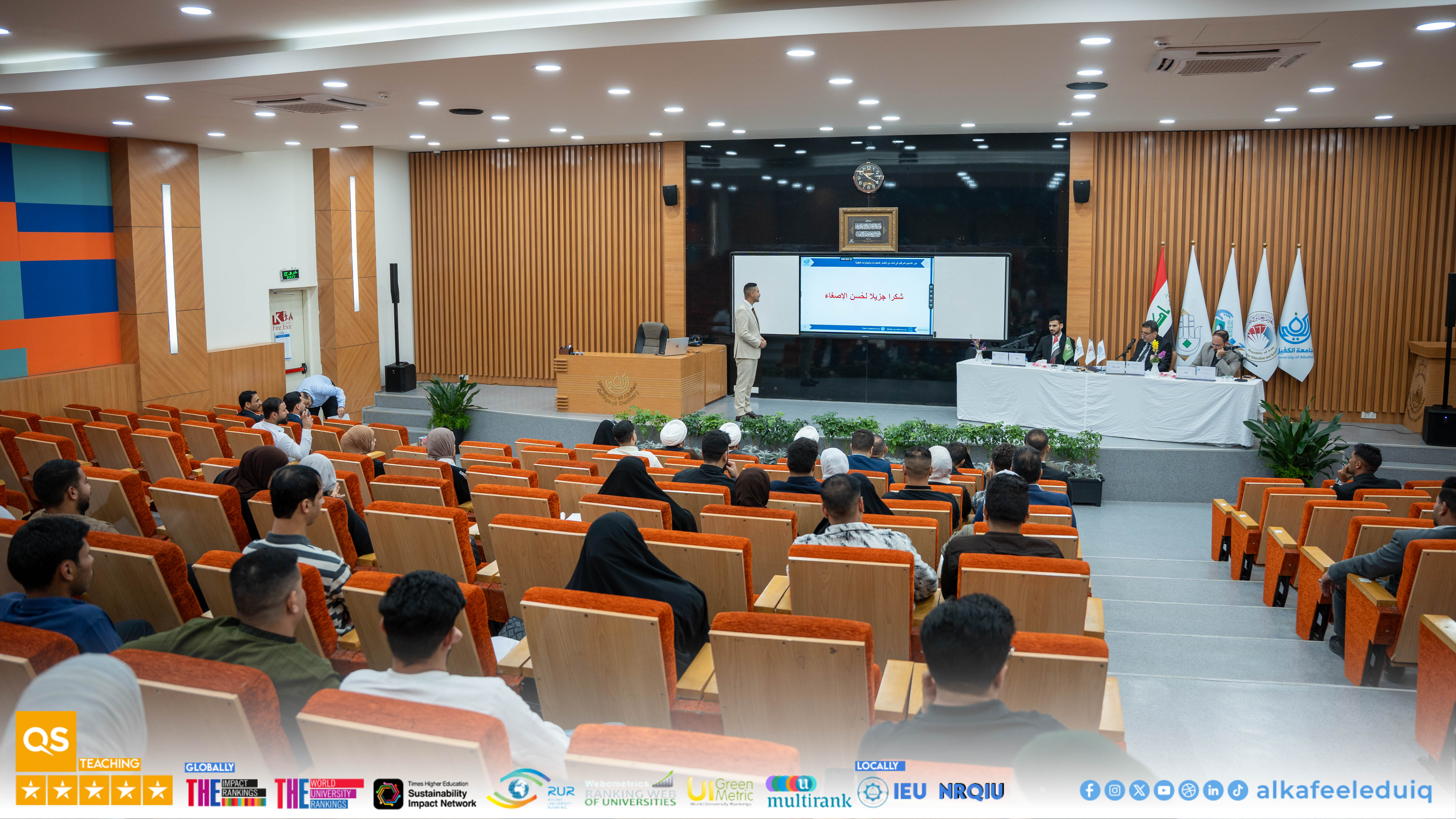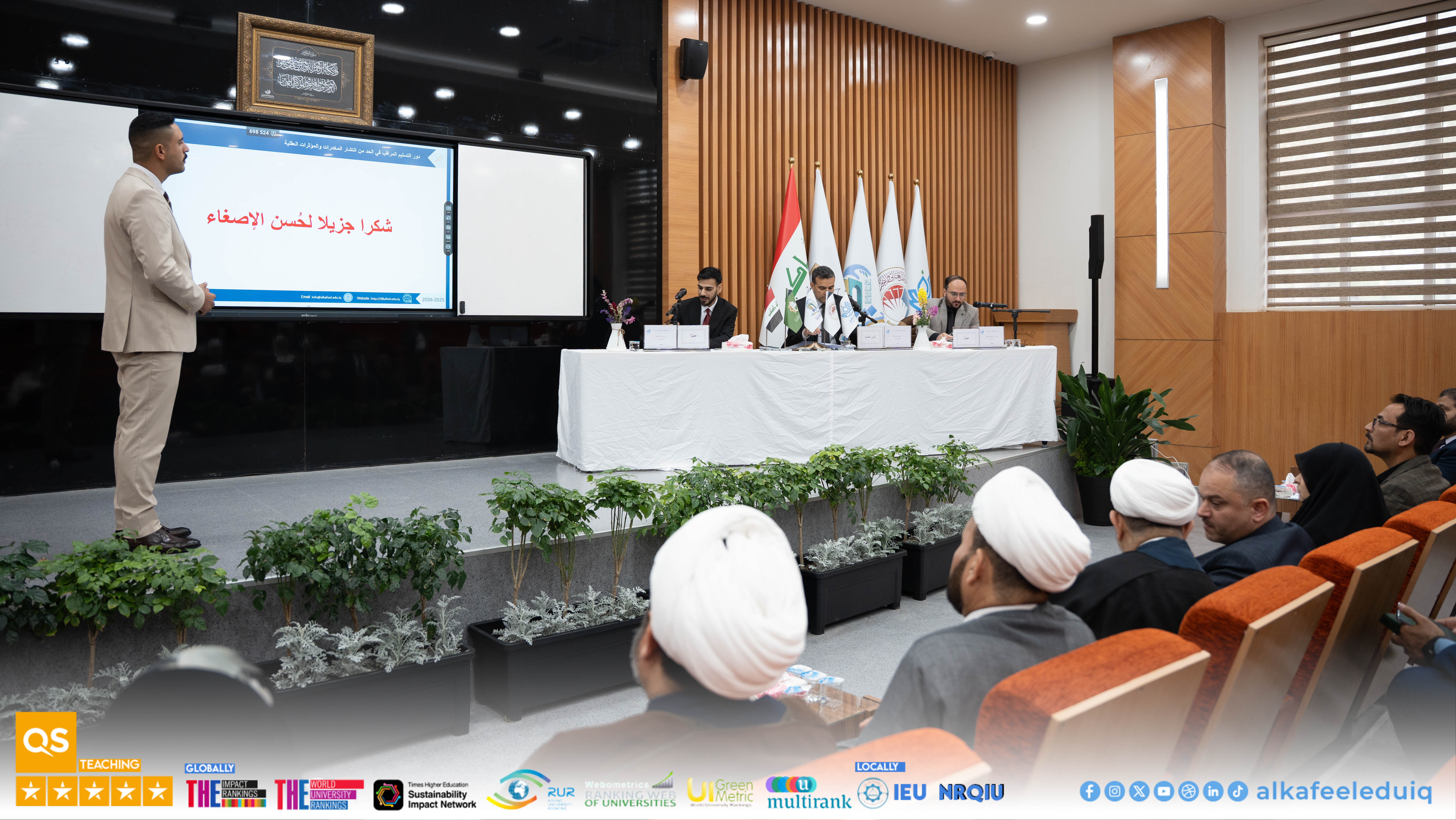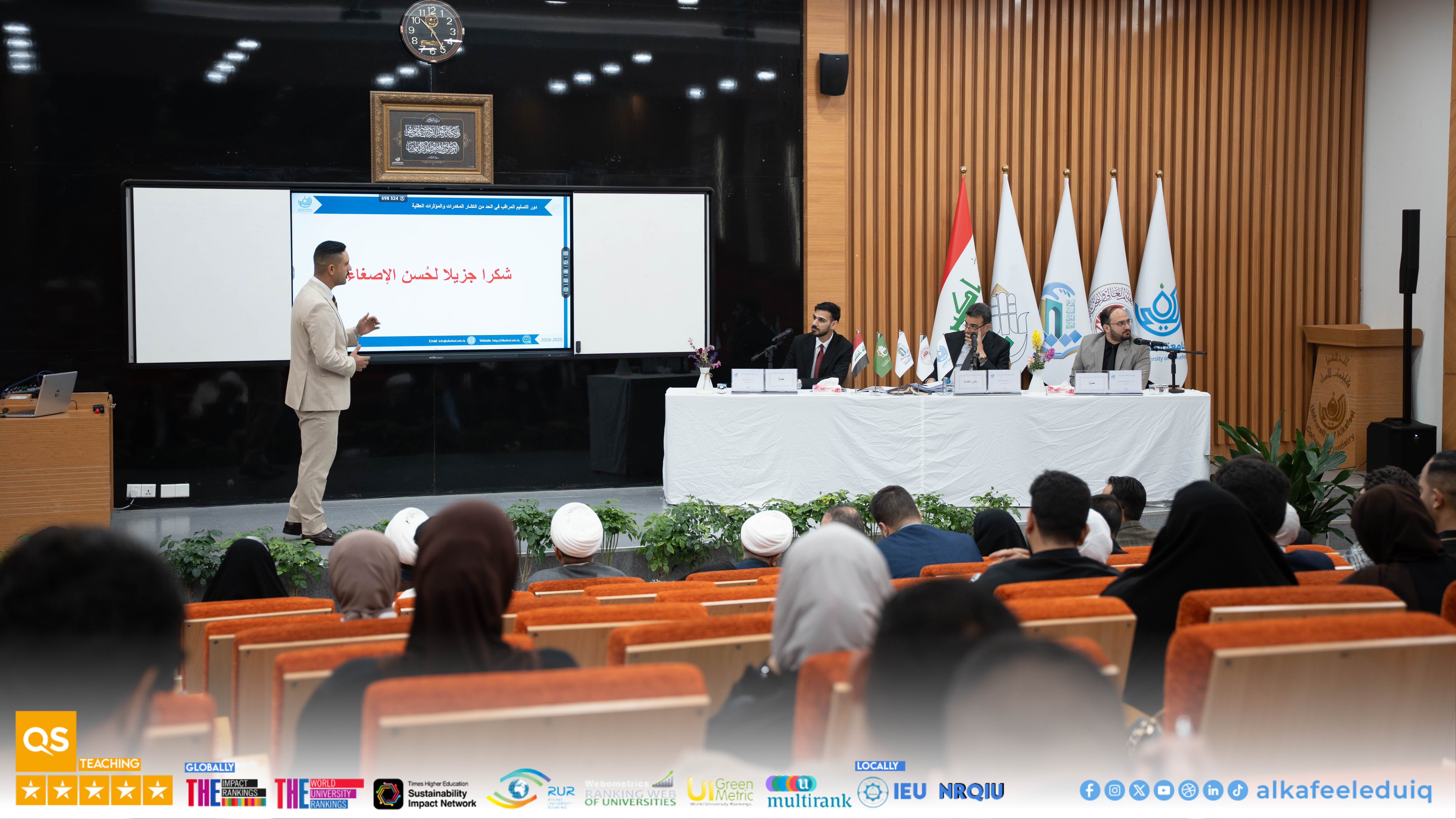 University of Alkafeel hosted the graduation research presentations for law students as part of its Sixth Student Scientific Conference, held on the slogan : "Graduation Research: Student Visions for Shaping Sustainable Future." Students from University of Alkafeel and the University of Kufa participated in the event, which took place on Saturday, 4 April 2026. The sessions included a distinguished presentation of graduation projects, where students presented law research addressing contemporary issues and contributing sound scientific solutions. A select group of professors and specialists attended, discussing and evaluating the presented works according to rigorous academic standards. The competition results were as follows : Abdullah Ahmed Hakim, a student from the College of Law at the University of Kufa, win first place. Mohammed Salman Farhoud, a student from the College of Law at University of Alkafeel , came second, and Ali Hakim Abdul Wahid, also from the College of Law at University of Alkafeel , did third .