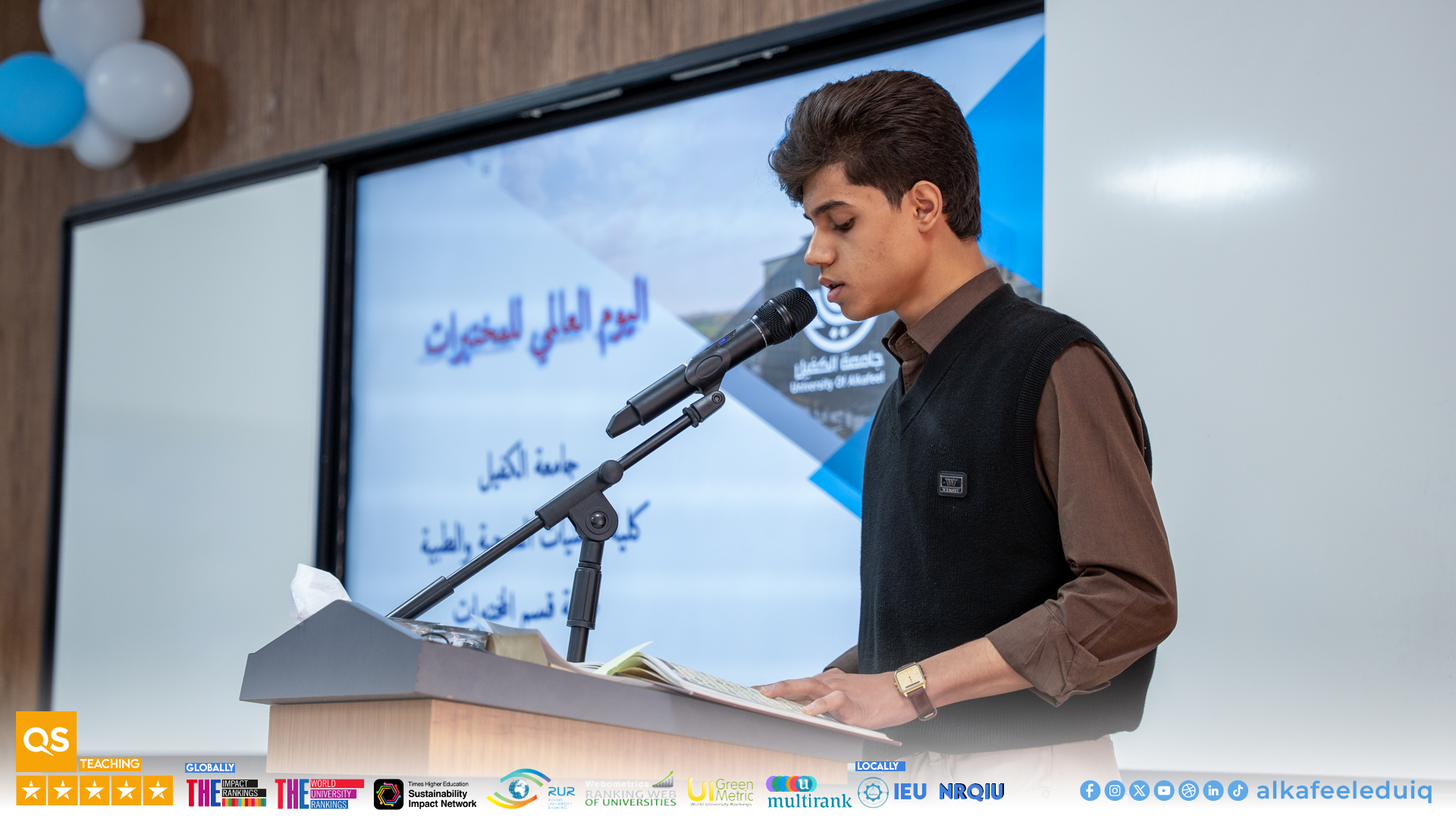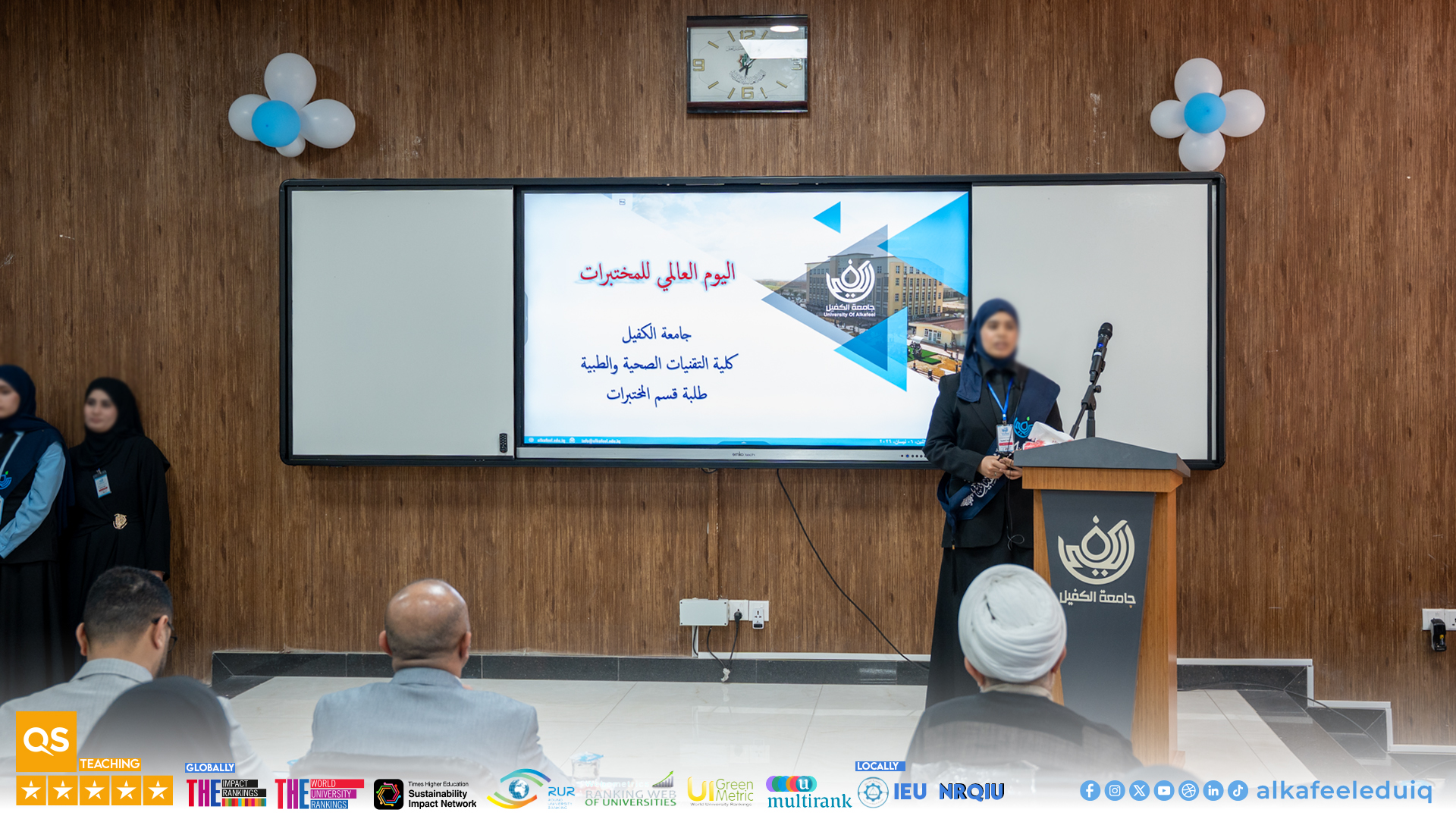 As part of the Second University Sustainability Week activities, the Department of Medical Laboratory Technology at the College of Medical and Health Technologies, University of Alkafeel , held a celebration on Monday, 6 April 2026, to mark World Laboratory Day. The event was attended by the Dean of the College, Prof.Dr. Fadhil Ismail Sharad, the Vice-Dean for Scientific Affairs, Asst.Prof.Dr. Sadiq Ghani Al-Mahna, and the Vice-Dean for Administrative Affairs, Asst.Prof.Dr. Amir Sadiq Yasser Al-Adhari.