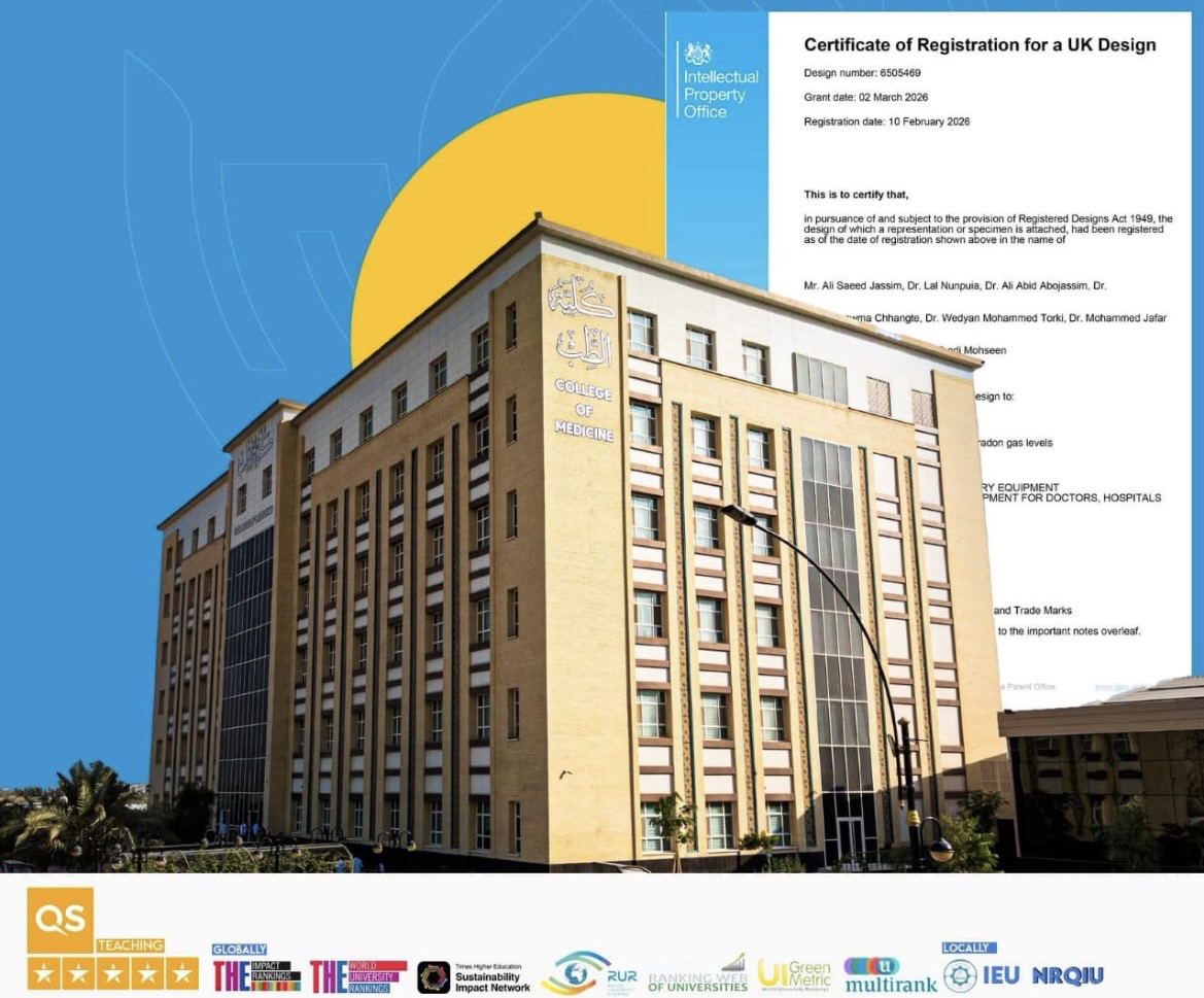 Dr. Mohammed Jaafar Dhiaa Zain, a lecturer at the College of Medicine, University of Alkafeel, received the patent . The researcher was granted a patent from the UK Intellectual Property Office for the design of an innovative radon gas detection device. Such a device is distinguished by its precise design, combining advanced technologies with ease of use. It relies on highly sensitive sensors to accurately measure radon gas levels and displays results instantly, enabling rapid preventative measures. Its small size and portability make it suitable for use in laboratories and various environments.